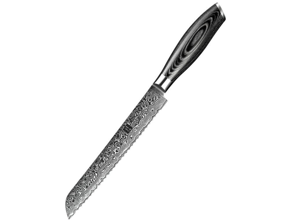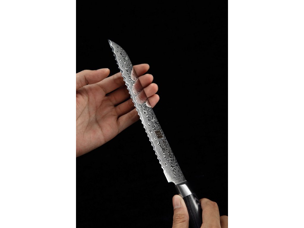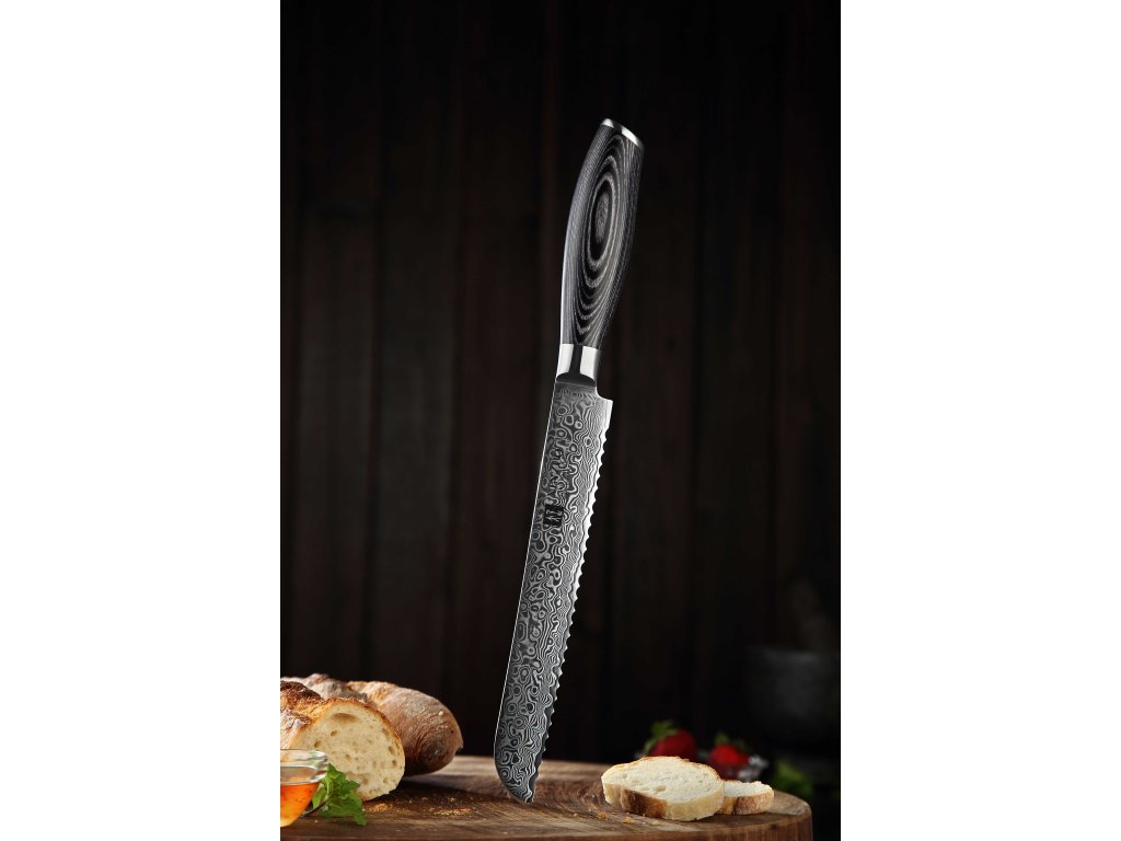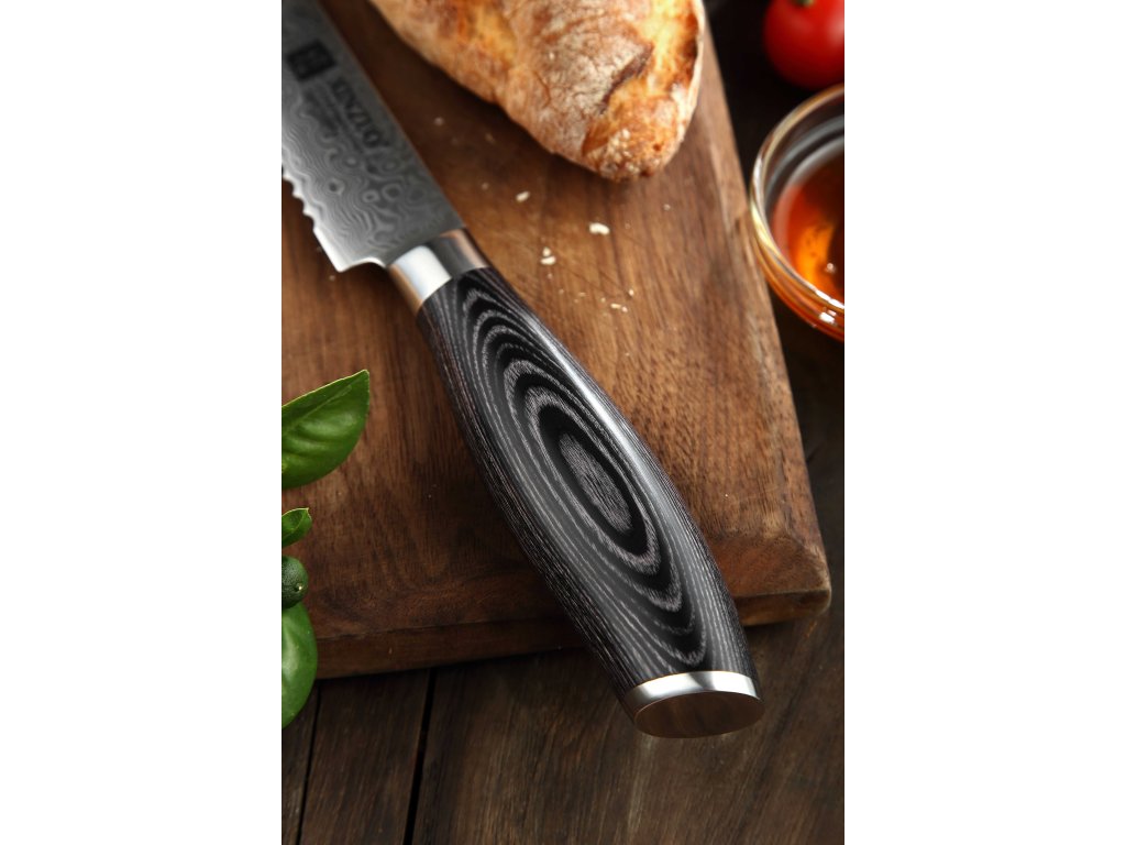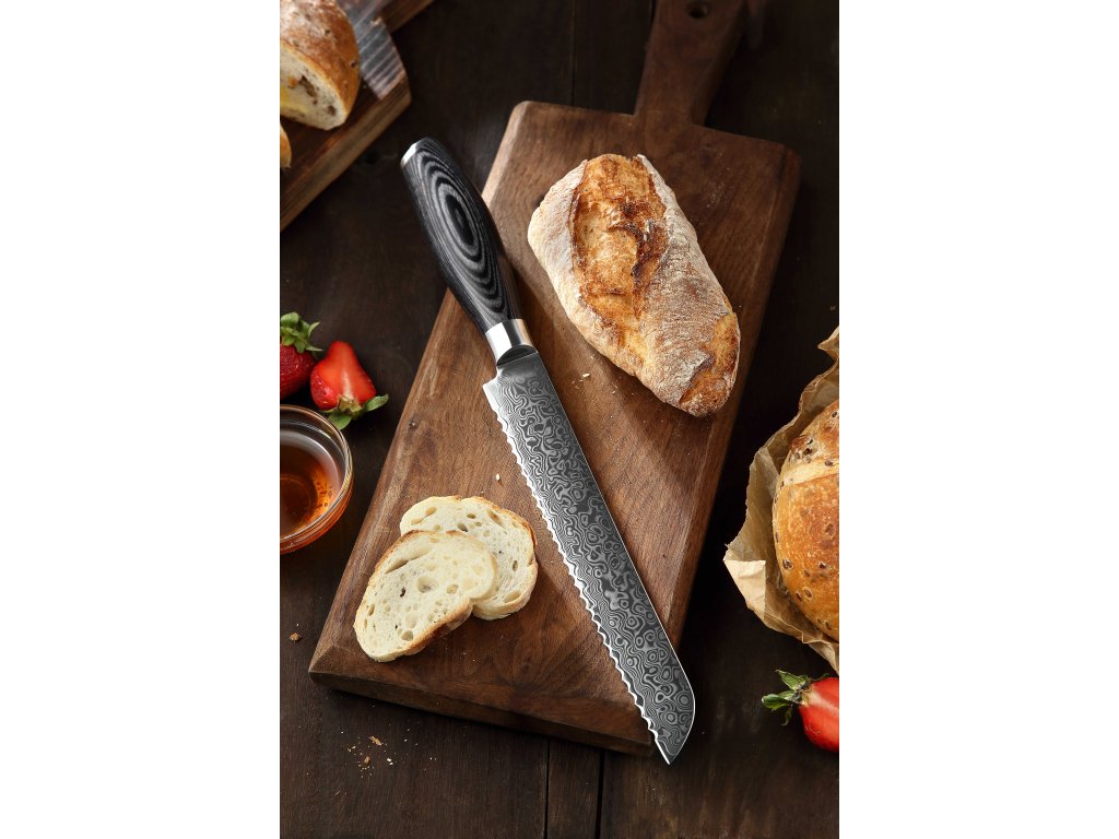 Dieses Brotmesser ist aus hochwertigem Damaszener Stahl gefertigt, der für die Herstellung der besten Messer verwendet wird. Die Messerklinge mit einer Härte von 60±2 Rockwell besteht aus 67 Lagen. Hochwertiger Stahl in einer Kombination von traditioneller Herstellung garantiert eine lange Lebensdauer des Messers. Die Oberfläche des Messers bietet beim Schneiden Komfort, ohne dass es reibt oder dass die Zutaten an die Klinge pappen. Der Griff des Messers ist aus Pakkaholz gefertigt, das aus den Wüstenregionen Nordamerikas gewonnen wird. Es zeichnet sich durch hohe Härte und Stabilität aus. Dank seiner perfekten Form und Länge wird das Schneiden zum Vergnügen und außerdem liegt das Messer gut in der Hand. Aufgrund des natürlichen Griff-Designs kann die Farbe und das Design leicht von den Produktbildern abweichen, da der Griff aus einem anderen Holzstück gefertigt wurde oder da das Alter des Holzes unterschiedlich ist. Der Farbton des Musters auf der Klinge kann unterschiedlich sein, da jedes Messer durch das Stahlschichten einzigartig ist.