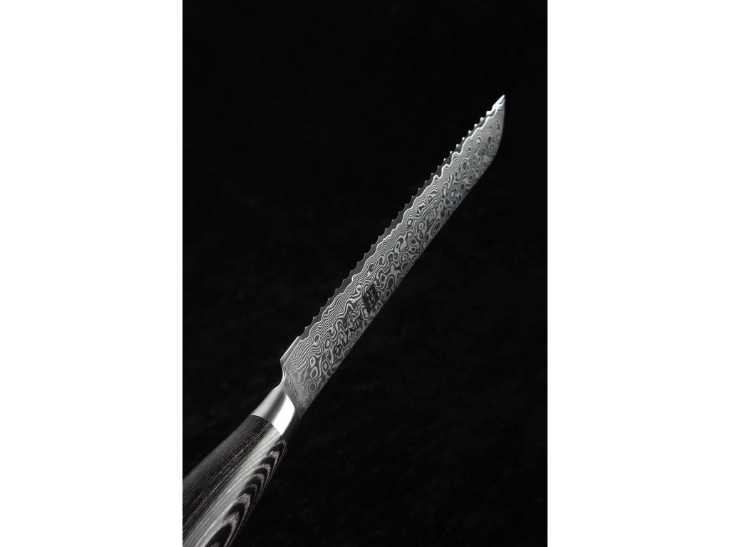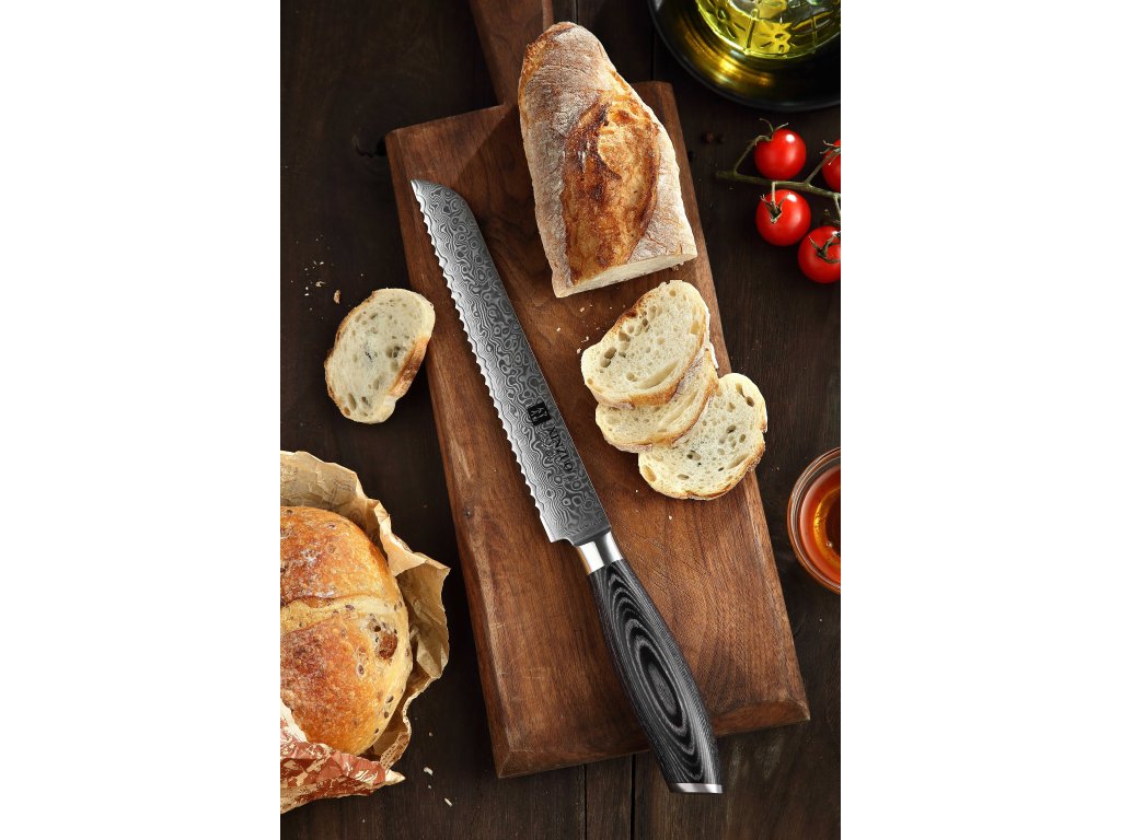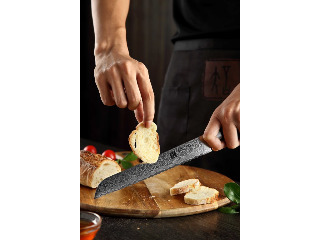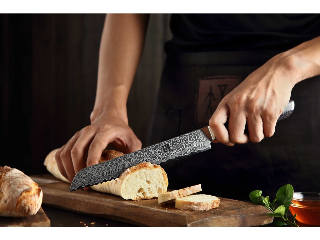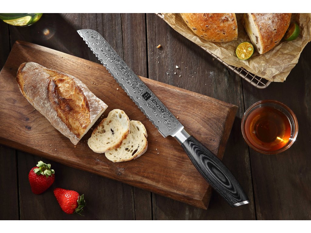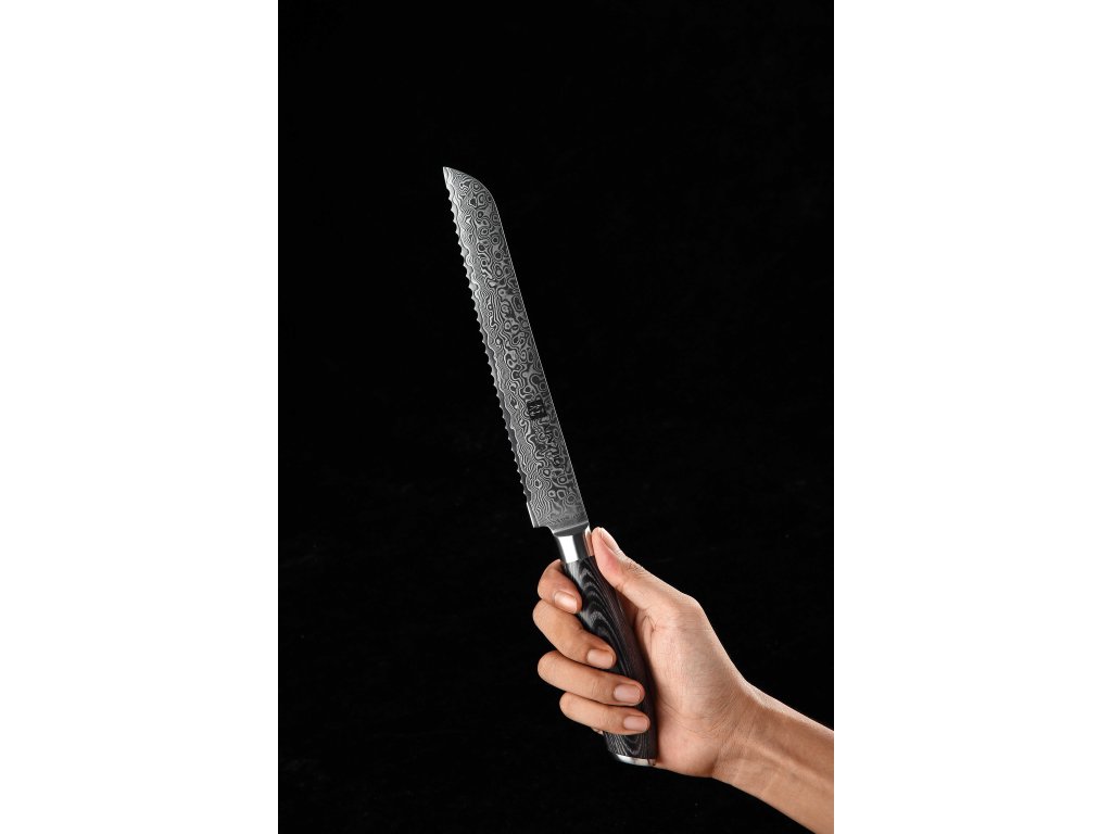 Dieses Brotmesser ist aus hochwertigem Damaszener Stahl gefertigt, der für die Herstellung der besten Messer verwendet wird. Die Messerklinge mit einer Härte von 60±2 Rockwell besteht aus 67 Lagen. Hochwertiger Stahl in einer Kombination von traditioneller Herstellung garantiert eine lange Lebensdauer des Messers. Die Oberfläche des Messers bietet beim Schneiden Komfort, ohne dass es reibt oder dass die Zutaten an die Klinge pappen. Der Griff des Messers ist aus Pakkaholz gefertigt, das aus den Wüstenregionen Nordamerikas gewonnen wird. Es zeichnet sich durch hohe Härte und Stabilität aus. Dank seiner perfekten Form und Länge wird das Schneiden zum Vergnügen und außerdem liegt das Messer gut in der Hand. Aufgrund des natürlichen Griff-Designs kann die Farbe und das Design leicht von den Produktbildern abweichen, da der Griff aus einem anderen Holzstück gefertigt wurde oder da das Alter des Holzes unterschiedlich ist. Der Farbton des Musters auf der Klinge kann unterschiedlich sein, da jedes Messer durch das Stahlschichten einzigartig ist.