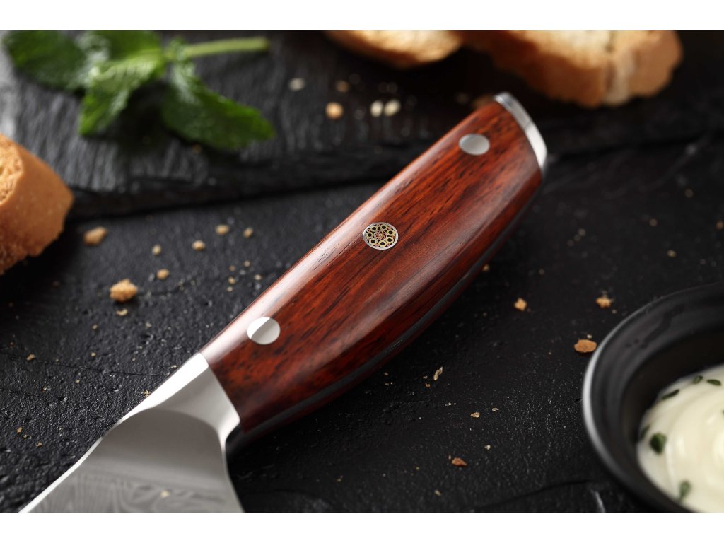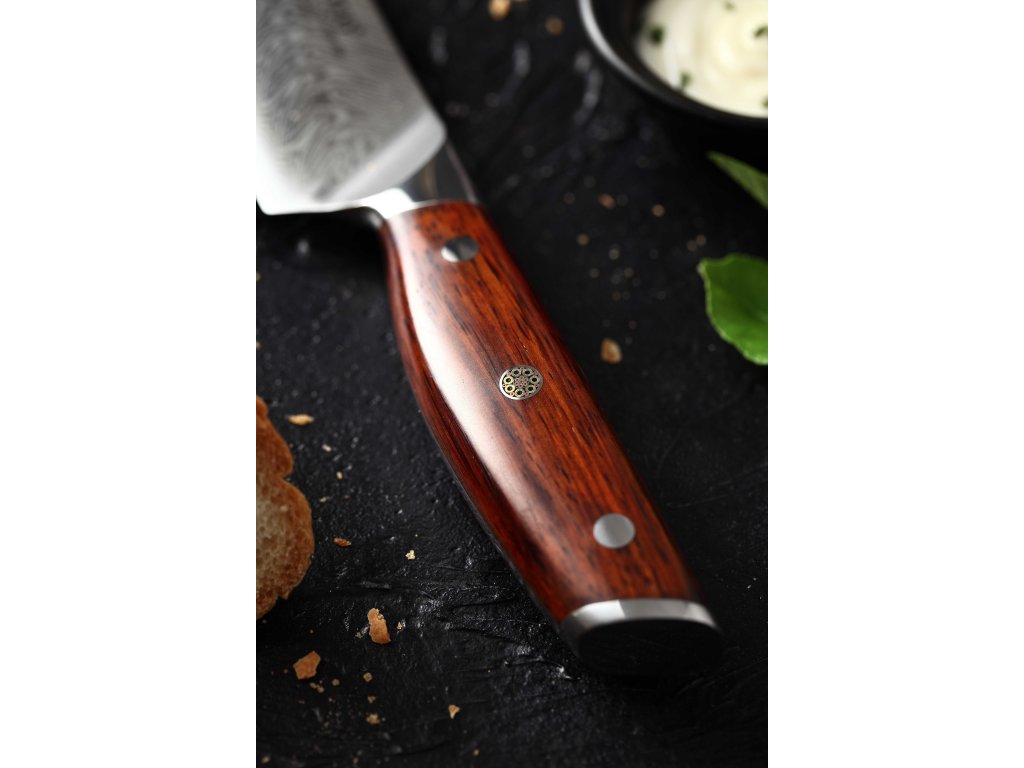 Dieses Brotmesser ist aus hochwertigem Damaszener Stahl gefertigt, der für die Herstellung der besten Messer verwendet wird. Die Messerklinge mit einer Härte von 60±2 Rockwell besteht aus 67 Lagen. Hochwertiger Stahl in einer Kombination von traditioneller Herstellung garantiert eine lange Lebensdauer des Messers. Die Oberfläche des Messers bietet beim Schneiden Komfort, ohne dass es reibt oder dass die Zutaten an die Klinge pappen. Der Griff des Messers ist aus Palisanderholz gefertigt, das aus den Wüstenregionen Nordamerikas gewonnen wird. Es zeichnet sich durch hohe Härte und Stabilität aus. Dank seiner perfekten Form und Länge wird das Schneiden zum Vergnügen und außerdem liegt das Messer gut in der Hand. Aufgrund des natürlichen Griff-Designs kann die Farbe und das Design leicht von den Produktbildern abweichen, da der Griff aus einem anderen Holzstück gefertigt wurde oder da das Alter des Holzes unterschiedlich ist. Der Farbton des Musters auf der Klinge kann unterschiedlich sein, da jedes Messer durch das Stahlschichten einzigartig ist.