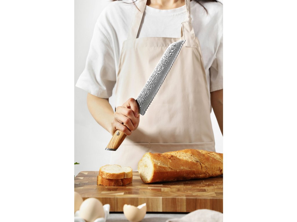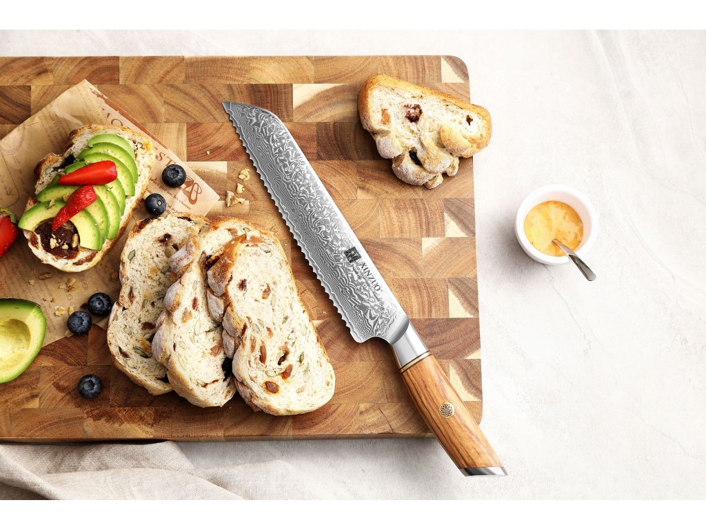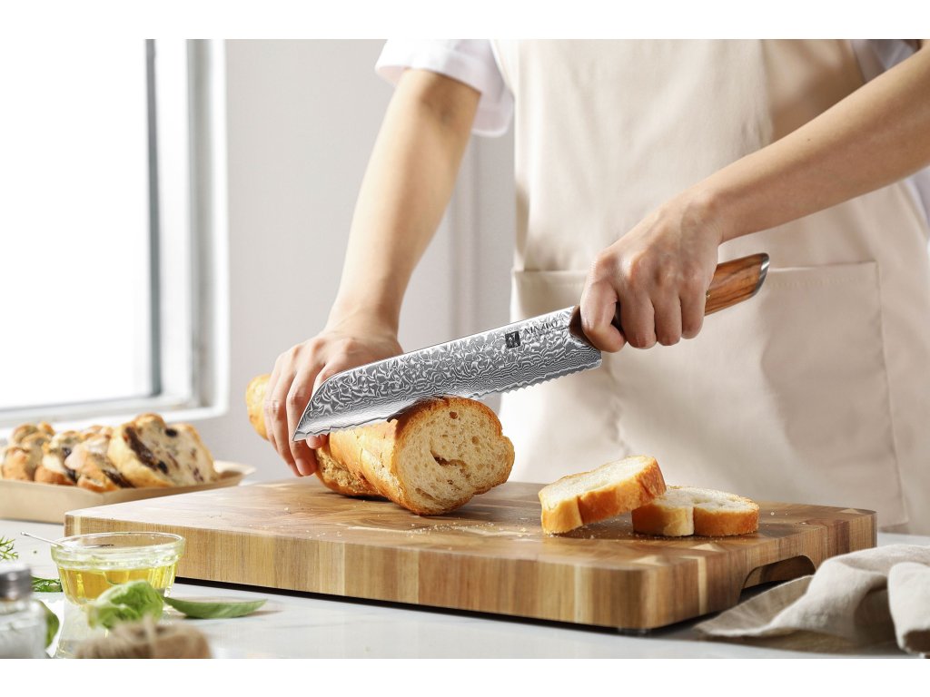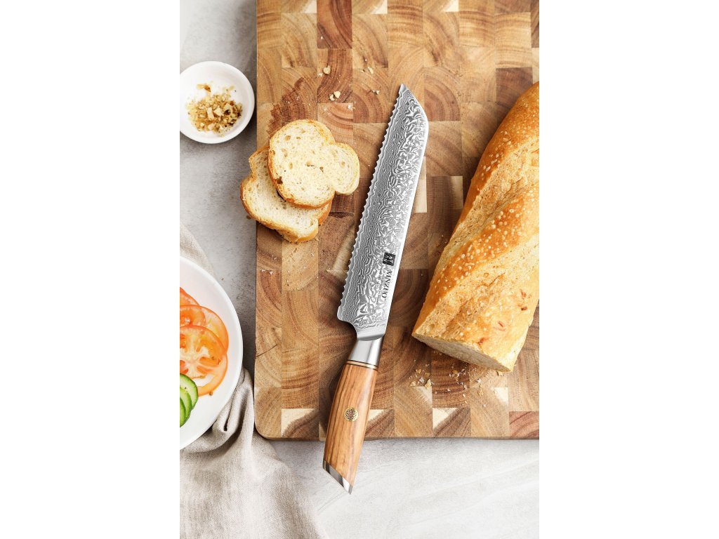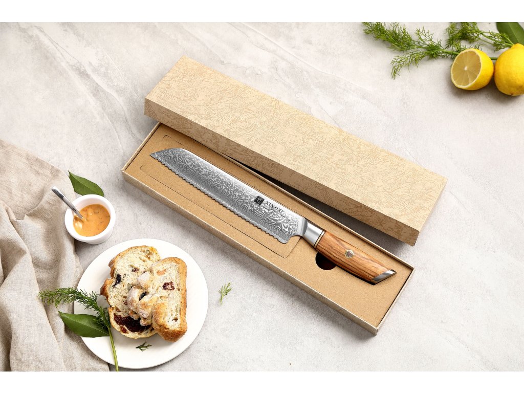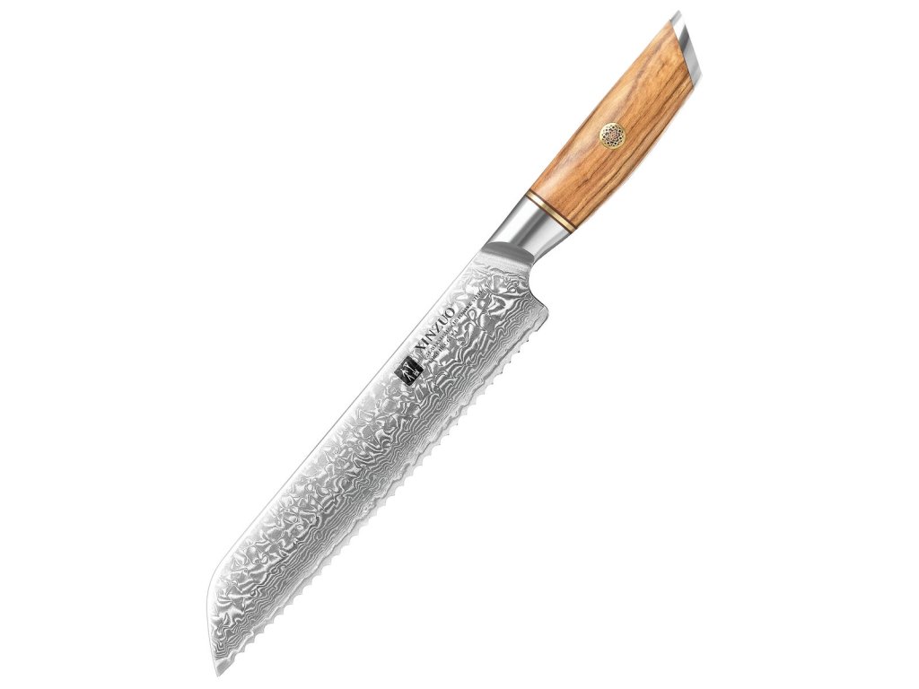 Premium Brotmesser XinZuo Lan B37, 21 cm ist ein Design-Stück mit Damastklinge und Olivenholzgriff. Seine hervorragende Ergonomie ist von großem Vorteil.