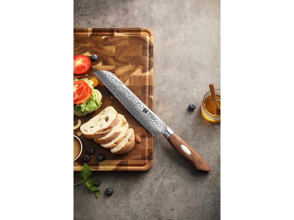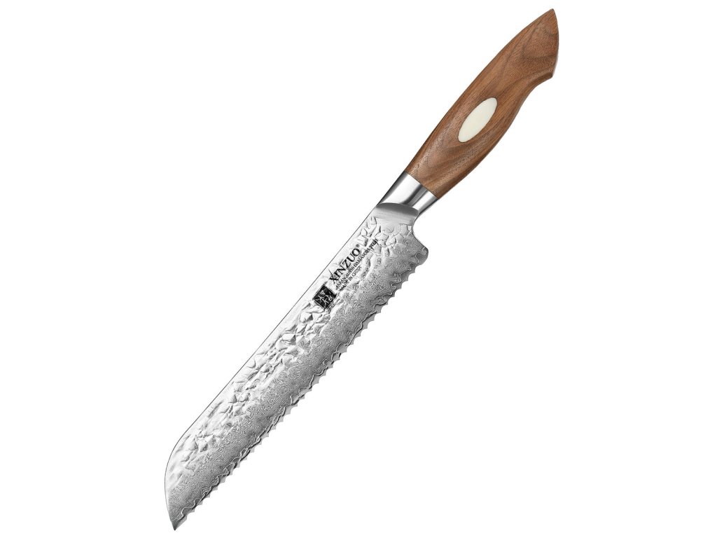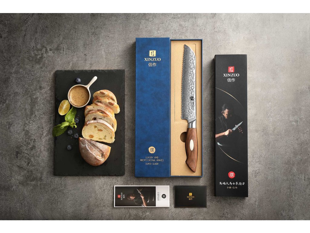Luxuriöses handgefertigtes Brotmesser XinZuo der Serie B46W, Klinge aus berühmtem japanischem AUS10-Stahl und elegantem Walnussholzgriff, in einer Geschenkbox verpackt.
