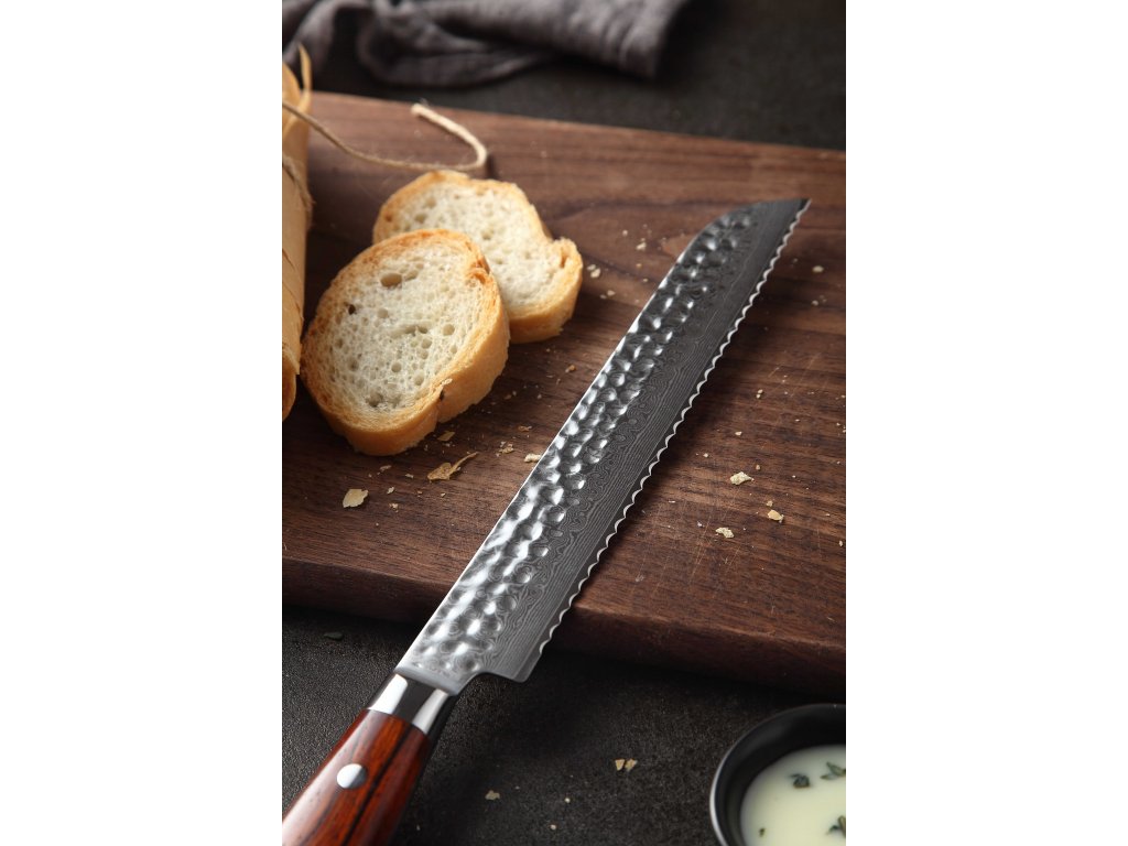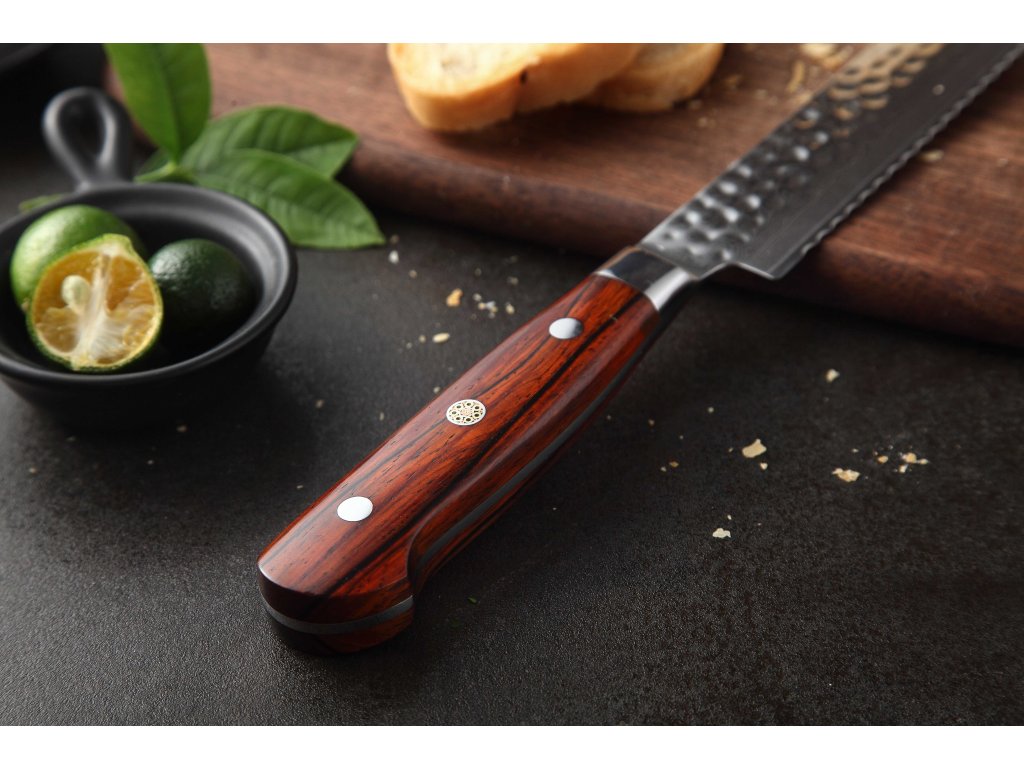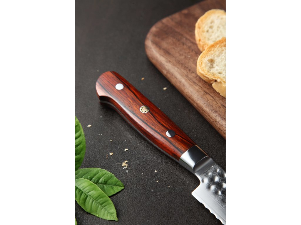 Dieses Konditormesser ist aus hochwertigem Damaszener Stahl gefertigt, der für die Herstellung der besten Messer verwendet wird. Die Messerklinge mit einer Härte von 60±2 Rockwell besteht aus 67 Lagen. Hochwertiger Stahl in einer Kombination von traditioneller Herstellung garantiert eine lange Lebensdauer des Messers. Die Oberfläche des Messers bietet beim Schneiden Komfort, ohne dass es reibt oder dass die Zutaten an die Klinge pappen. Der Messergriff besteht aus Palisanderholz, das mit der Zeit weder weicher wird noch Geruch annimmt. Dank seiner perfekten Form und Länge wird das Schneiden zum Vergnügen und außerdem liegt das Messer gut in der Hand. Aufgrund des natürlichen Griff-Designs kann die Farbe und das Design leicht von den Produktbildern abweichen, da der Griff aus einem anderen Holzstück gefertigt wurde oder da das Alter des Holzes unterschiedlich ist. Der Farbton des Musters auf der Klinge kann unterschiedlich sein, da jedes Messer durch das Stahlschichten einzigartig ist.