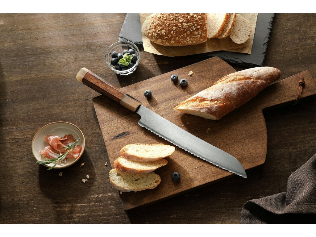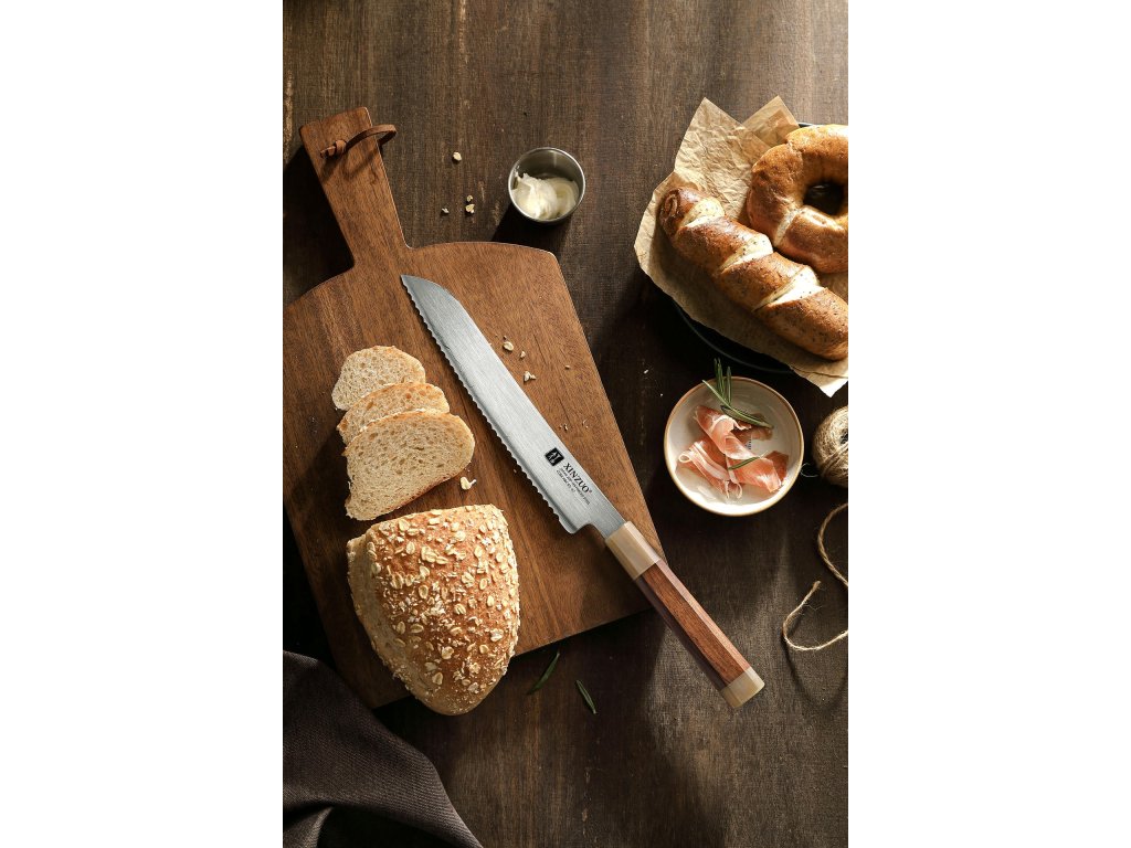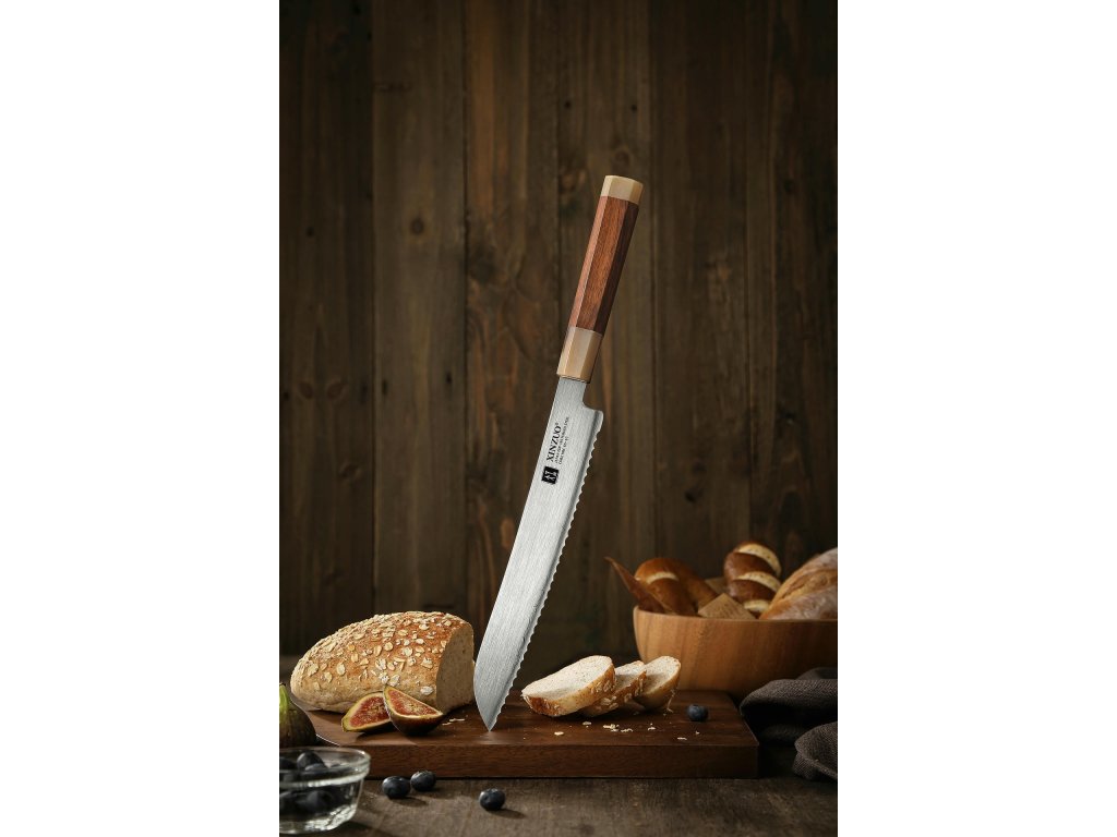 Das luxuriose Brotmesser XinZuo Zhen X05Z 22 cm mit einer Klinge aus japanischem Stahl und einem traditionellen achteckigen Griff, wird in einer eleganten Holzbox geliefert.