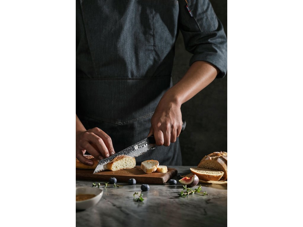 Dieses Chefmesser ist aus hochwertigem Damaszener Stahl gefertigt, der für die Herstellung der besten Messer verwendet wird. Die Messerklinge mit einer Härte von 60±2 Rockwell besteht aus 67 Lagen. Hochwertiger Stahl in einer Kombination von traditioneller Herstellung garantiert eine lange Lebensdauer des Messers. Die Oberfläche des Messers bietet beim Schneiden Komfort, ohne dass es reibt oder dass die Zutaten an die Klinge pappen. Die Messer werden im 30°-Winkel geschliffen.