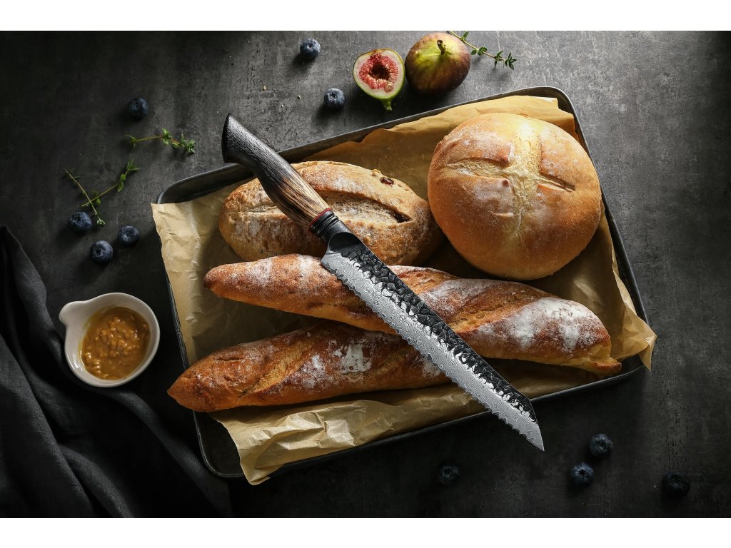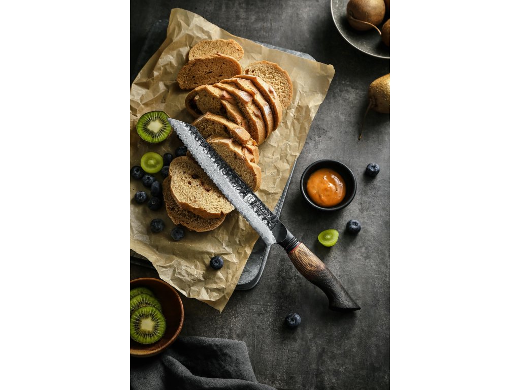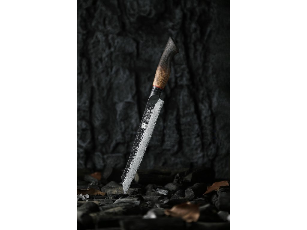 Ein Brotmesser XinZuo Mo X06 22 cm mit einzigartiger Damastklinge und handgefertigtem Eichenholzgriff, der fließend von einer hellen, warmen Farbe zu einer rauchigen, dunklen übergeht.