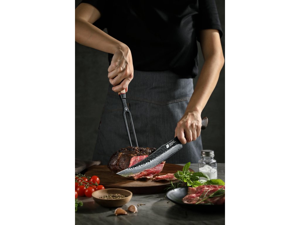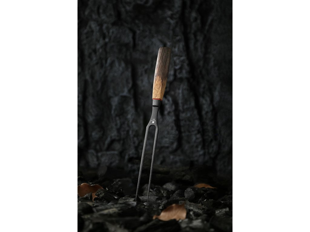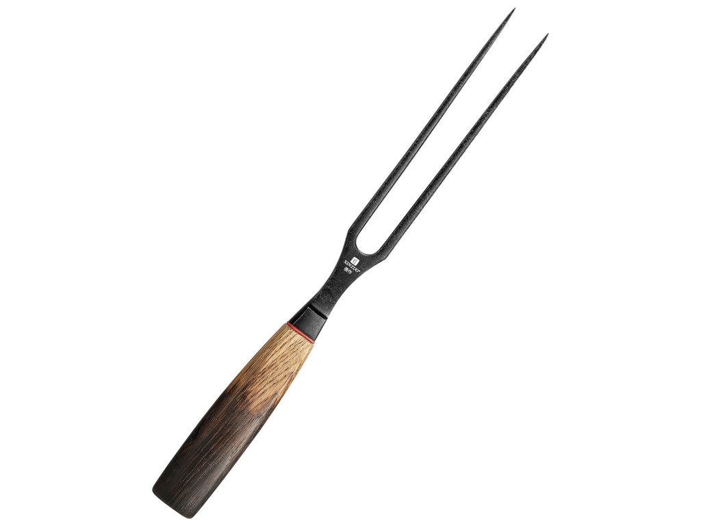 Hochwertige XinZuo-Fleischgabel aus der Serie Mo X06 aus rostfreiem Stahl mit einem Eichenholzgriff. Ein praktischer Helfer beim Braten und Schneiden von zubereitetem Fleisch.