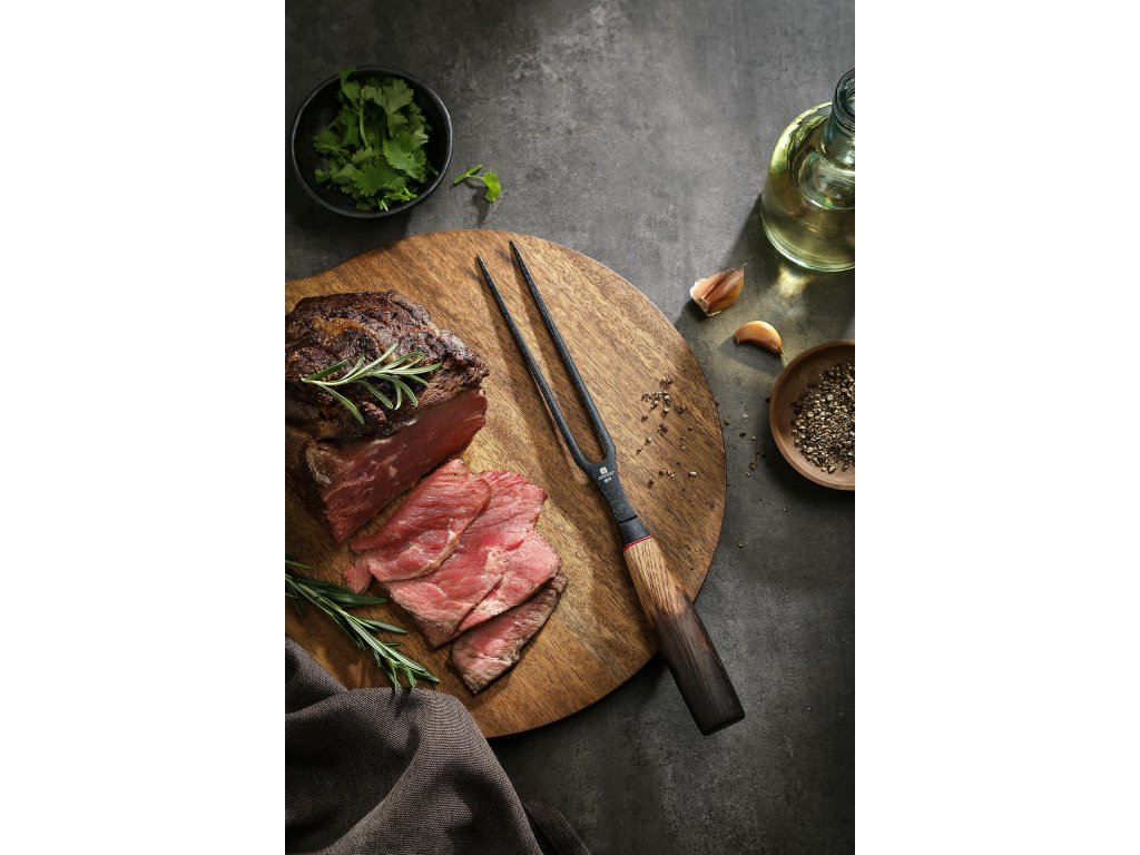 Die Fleischgabel werden Sie vor allem beim Umgang mit Fleisch zu schätzen wissen. Dank ihr können Sie den Braten im Ofen bequem wenden und ihn dann einfach aufschneiden, ohne sich zu verbrennen oder dass das Fleisch auf dem Schneidebrett verrutscht. Die Fleischgabel erleichtert das Braten und Portionieren erheblich. Sie ist zum Aufschneiden größerer Fleischstücke und kleinerer Geflügelarten geeignet.