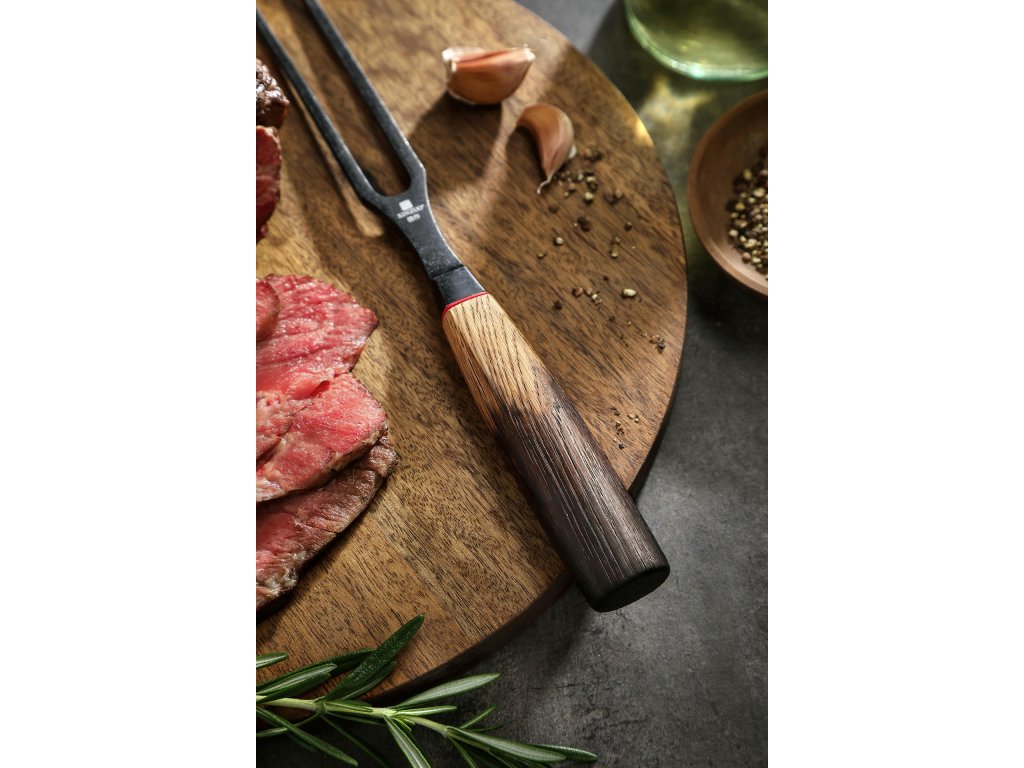 Die Premium Fleischgabel aus der Mo X06-Serie aus rostfreiem Edelstahl mit hochwertigem Griff aus Eichenholz. Die Zinken sind aus rostfreiem Stahl 430 gefertigt und der Griff ist aus Weiß-Eiche aus den rauen Wäldern Nordamerikas handgefertigt. Jeder Griff ist einzigartig in seinem Retro-Design und seiner Textur. Es beginnt mit einem markanten Element aus rotem G10-Verbundmaterial.