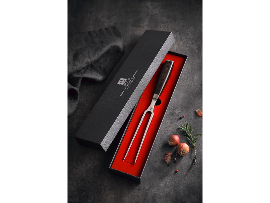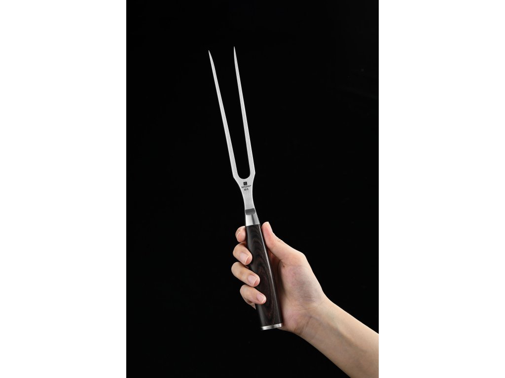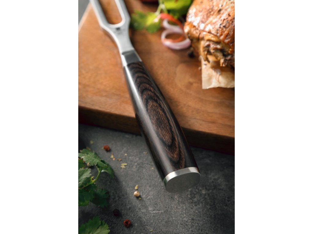 Hochwertige Fleischgabel von XinZuo aus der Serie He B1H, gefertigt aus Edelstahl mit einem Griff aus hochwertigem Pakkaholz. Ein unverzichtbarer Helfer beim Braten von Fleisch. Hergestellt in Yangjiang, China. Der ergonomisch geformte Griff erleichtert die Handhabung und passt gut in die Hand. Ihr elegantes Design wird das Design Ihrer Küche betonen.