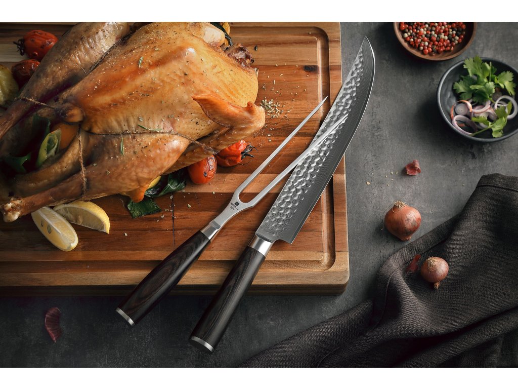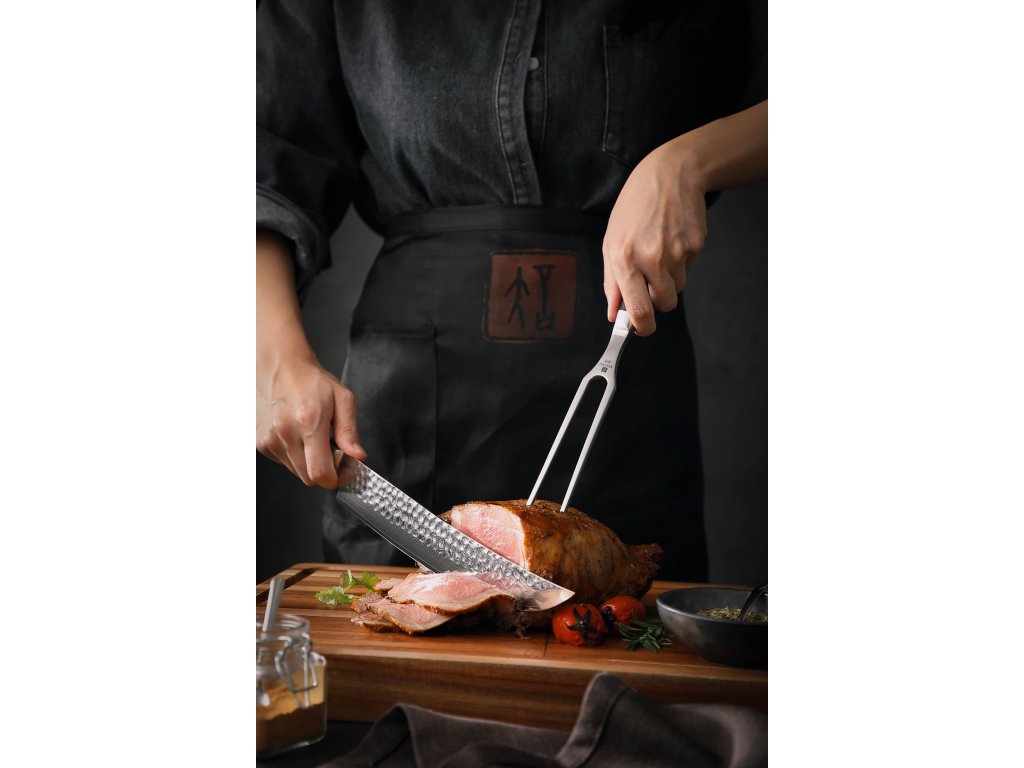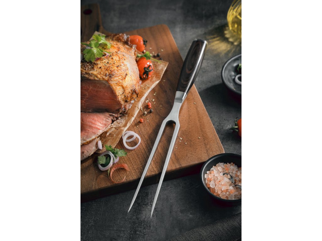 Die Fleischgabel werden Sie vor allem beim Umgang mit Fleisch zu schätzen wissen. Dank ihr können Sie den Braten im Ofen bequem wenden und ihn dann einfach aufschneiden, ohne sich zu verbrennen oder dass das Fleisch auf dem Schneidebrett verrutscht. Die Fleischgabel erleichtert das Braten und Portionieren erheblich. Sie ist zum Aufschneiden größerer Fleischstücke und kleinerer Geflügelarten geeignet.