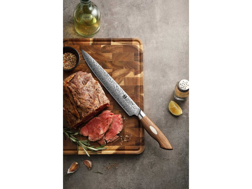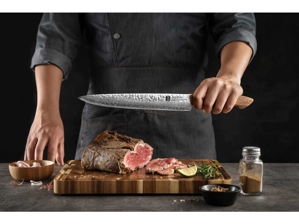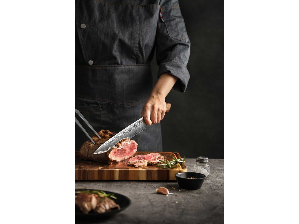 Fleischmesser - Für präzises Schneiden, ohne Strukturverlust. Das Fleisch verdient perfekte Sorgfalt beim Schneiden, und deshalb ist ein hochwertiges Fleischmesser in jeder Küche unverzichtbar. Dank der richtig geformten Klinge können Sie das Fleisch leicht in Stücke zerschneiden, ohne dass es dabei ungewollt zerreißt – das könnte nämlich die Struktur des Fleisches beschädigen und bei der weiteren Verarbeitung zu Saftverlusten führen. Das Fleischmesser wurde für glatte, präzise und elegante Schnitte entwickelt - egal, ob Sie Fleisch in saftige Steaks, feine Scheiben oder große Stücke für die Weiterverarbeitung zerlegen wollen.