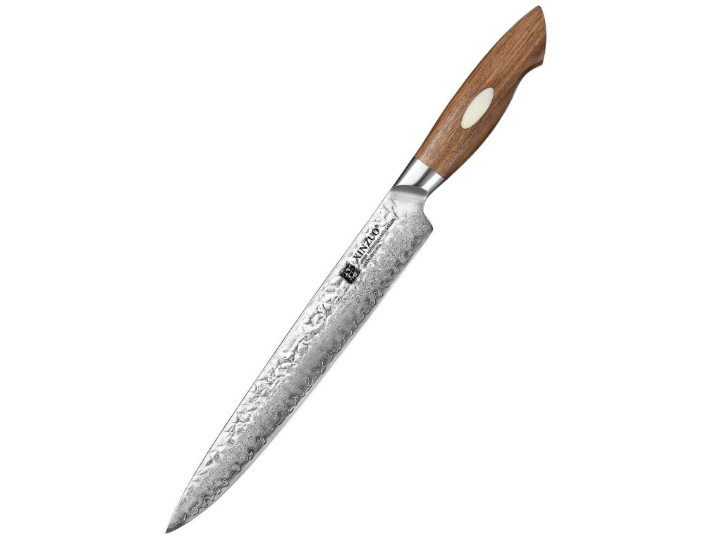Dieses Fleischmesser ist aus hochwertigem AUS10-Damaststahl gefertigt, der von der renommierten Firma Aichi Steel in Japan hergestellt wird. Dieser innovative japanische Stahl zeichnet sich durch seine hohe Schärfe und Haltbarkeit aus. Er hat einen hohen Gehalt von Kohlenstoff (1,10 %) und Chrom (14,50 %), dank dessen er korrosionsbeständig ist. Die Klinge des Messers mit einer Härte von 60±2 Rockwell besteht aus 67 Lagen und wurde einer kryogenen Vakuumbehandlung unterzogen. Der Korrosionsschutz wird durch den äußeren Edelstahl SUS430 gewährleistet, in den der Kern des Messers (aus AUS-10) eingebettet ist. Der Farbton des Musters auf der Klinge kann unterschiedlich sein, da jedes Messer durch das Stahlschichten einzigartig ist.