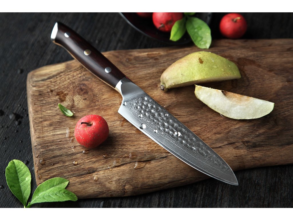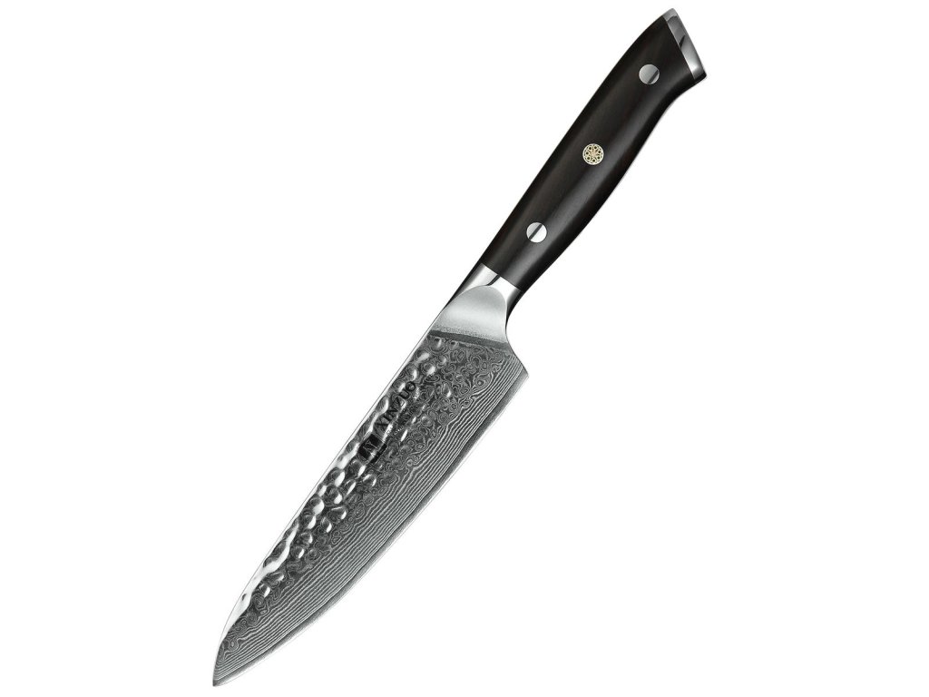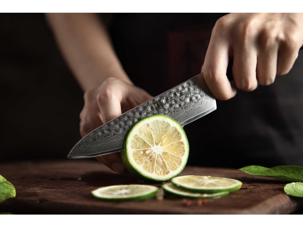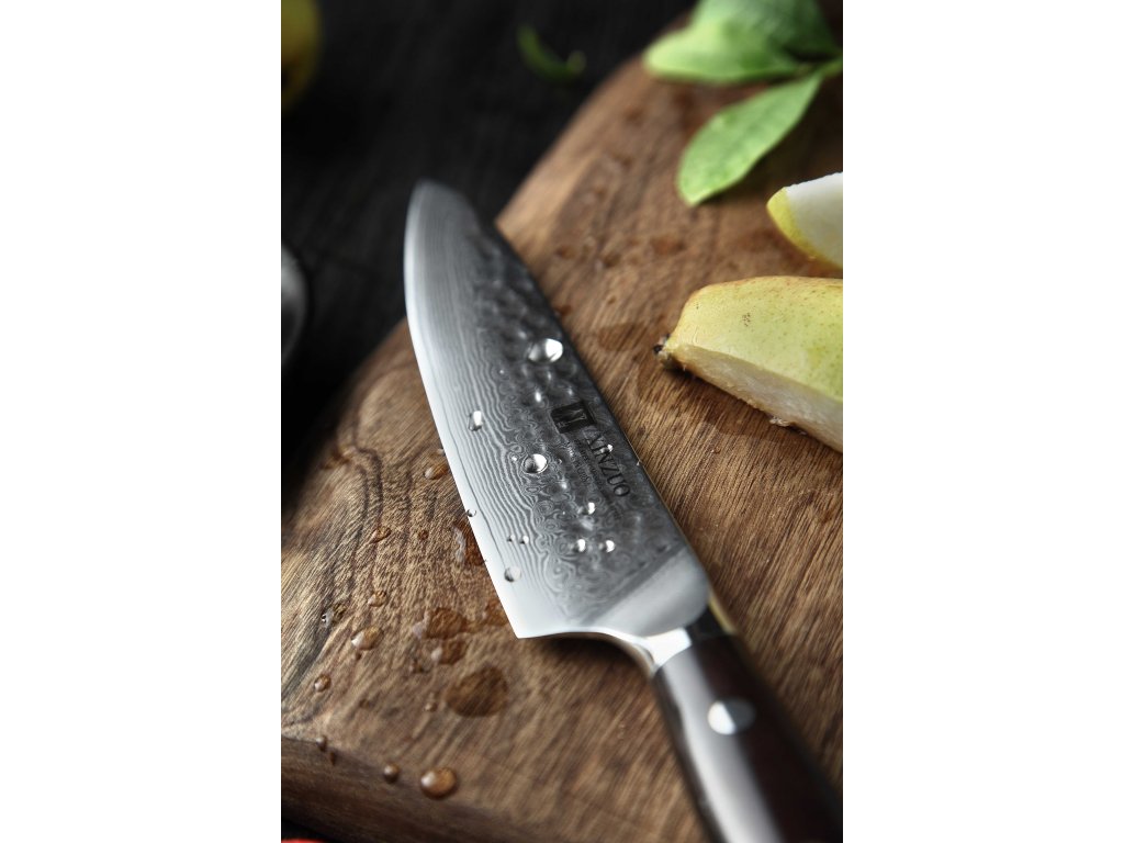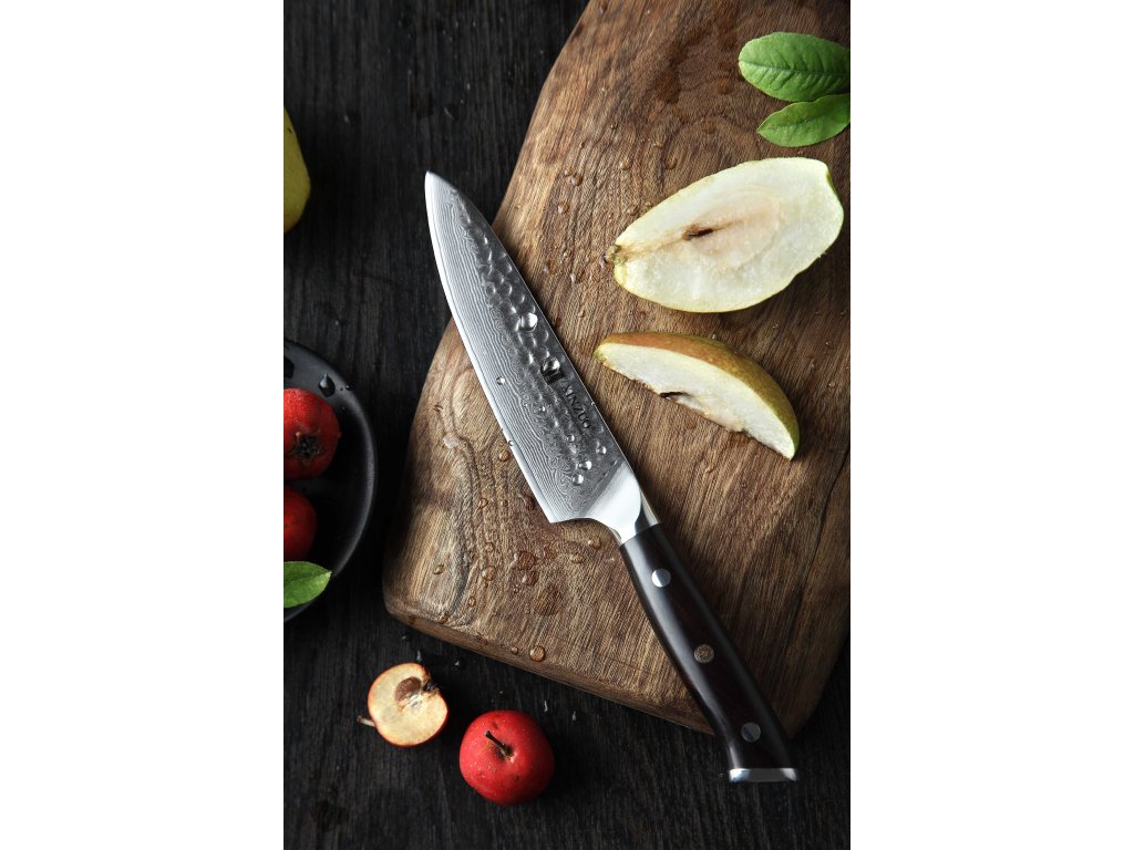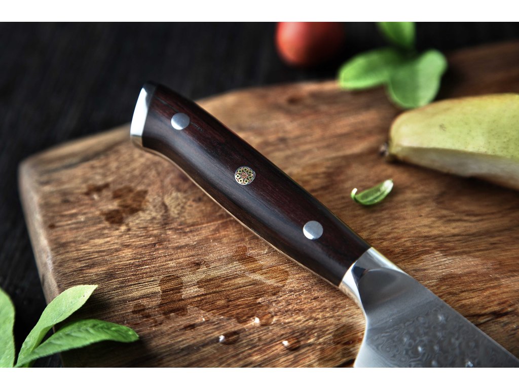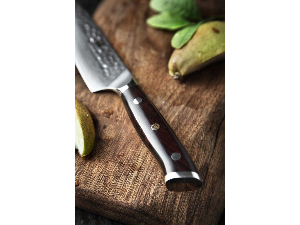 Dieses Obst- und Gemüsemesser ist aus hochwertigem Damaszener Stahl gefertigt, der für die Herstellung der besten Messer verwendet wird. Die Messerklinge mit einer Härte von 60±2 Rockwell besteht aus 67 Lagen. Hochwertiger Stahl in einer Kombination von traditioneller Herstellung garantiert eine lange Lebensdauer des Messers. Die Oberfläche des Messers bietet beim Schneiden Komfort, ohne dass es reibt oder dass die Zutaten an die Klinge pappen. Der Griff des Messers ist aus Ebenholz gefertigt, das mit der Zeit weder weicher wird noch einen Geruch annimmt. Dank seiner perfekten Form und Länge wird das Schneiden zum Vergnügen und außerdem liegt das Messer gut in der Hand. Aufgrund des natürlichen Griff-Designs kann die Farbe und das Design leicht von den Produktbildern abweichen, da der Griff aus einem anderen Holzstück gefertigt wurde oder da das Alter des Holzes unterschiedlich ist. Der Farbton des Musters auf der Klinge kann unterschiedlich sein, da jedes Messer durch das Stahlschichten einzigartig ist.