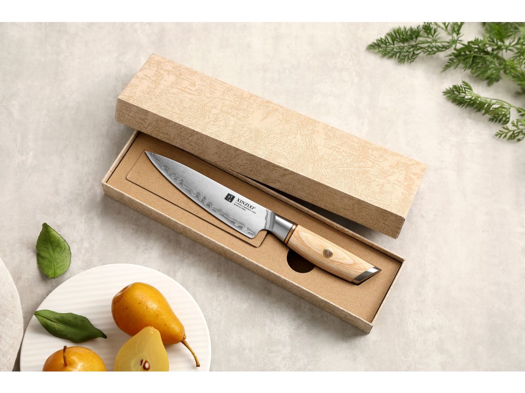 Das Gemüsemesser XinZuo Messer Lan B37S ist in einer eleganten, umweltfreundlichen Box verpackt, die sie zu einem idealen, praktischen Haushaltsgeschenk macht. Die Box dieser Messerserie basiert auf umweltfreundlichen Materialien und Umweltfreundlichkeit und hat ein einheitliches, elegantes Design. Das hochwertige Messer von XinZuo in solch einer Box wird jedem Beschenken Freude machen.