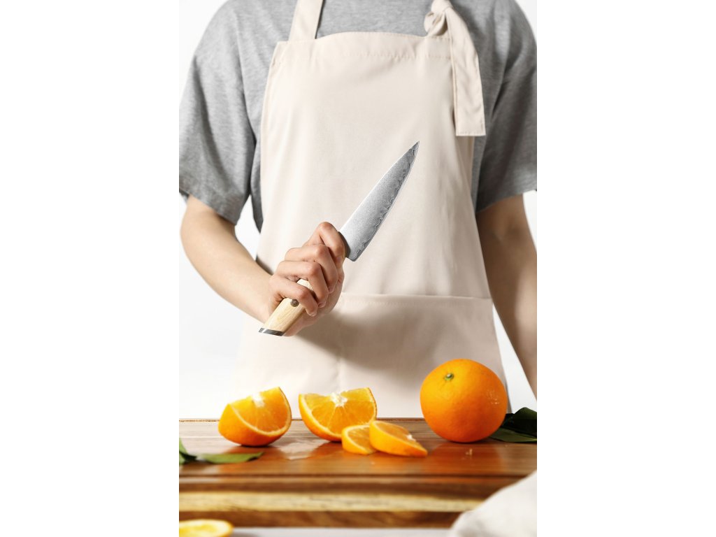 Dieses Gemüsemesser ist aus drei Lagen hochwertigem Verbundstahl gefertigt. Der Kern des Messers besteht aus 10Cr15CoMoV-Stahl und ist beidseitig durch rostfreien SUS410-Stahl gegen Korrosion geschützt. Das Messer hat eine Härte von 60±2 Rockwell. Hochwertiger Stahl in einer Kombination von traditioneller Herstellung garantiert eine lange Lebensdauer des Messers. Die Oberfläche des Messers bietet beim Schneiden Komfort, ohne dass es reibt oder dass die Zutaten an die Klinge pappen. Die Klinge ist von Messerschmieden nach japanischer Art in einem Winkel von 15° auf beiden Seiten handgeschliffen. Der Farbton des Musters auf der Klinge kann unterschiedlich sein, da jedes Messer durch das Stahlschichten einzigartig ist.