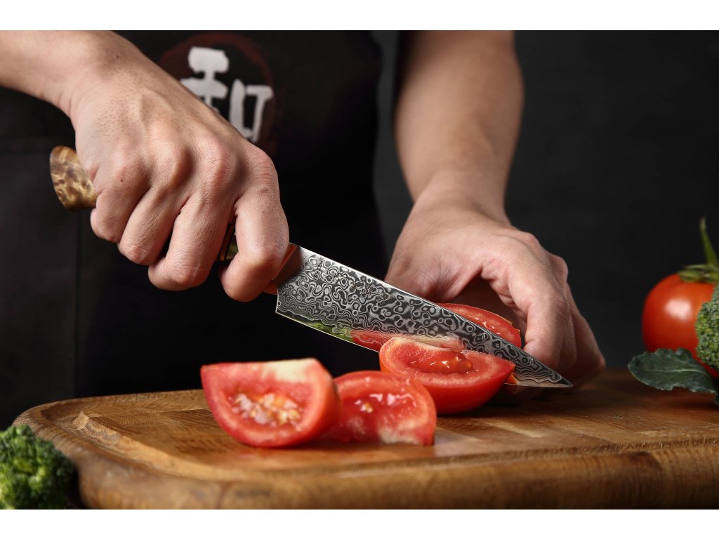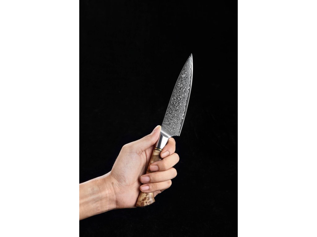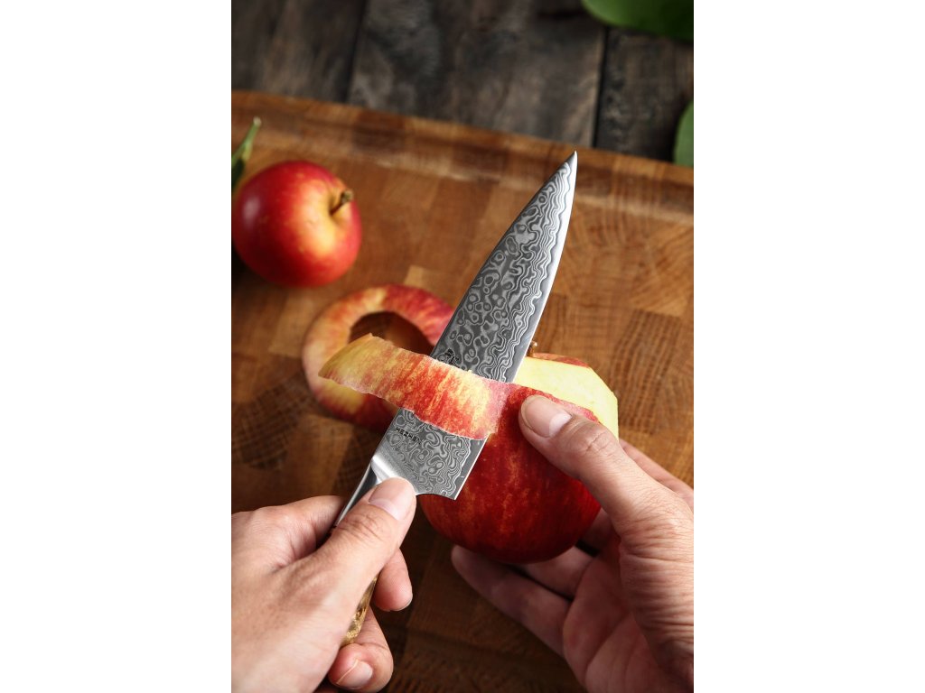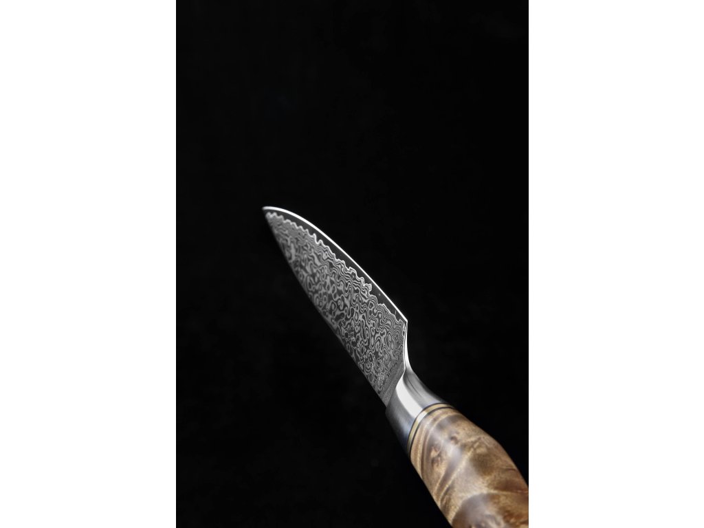Dieses Gemüsemesser ist aus hochwertigem Damaszener Stahl gefertigt, der für die Herstellung der besten Messer verwendet wird. Die Messerklinge mit einer Härte von 60±2 Rockwell besteht aus 67 Lagen. Hochwertiger Stahl in einer Kombination von traditioneller Herstellung garantiert eine lange Lebensdauer des Messers. Seine Oberfläche bietet Komfort beim Schneiden, ohne dass es reibt oder dass die Zutaten an die Klinge pappen. Der Farbton des Musters auf der Klinge kann unterschiedlich sein, da jedes Messer durch das Stahlschichten einzigartig ist.