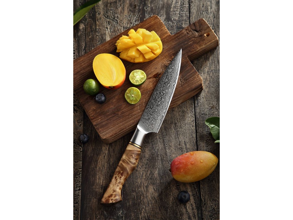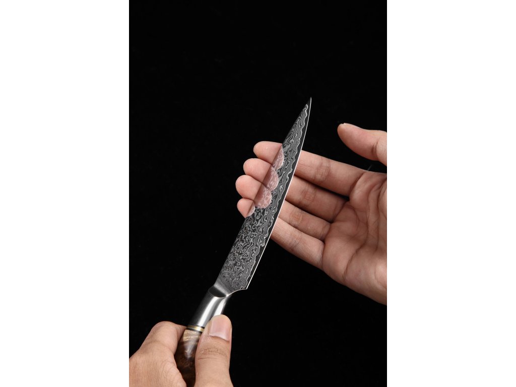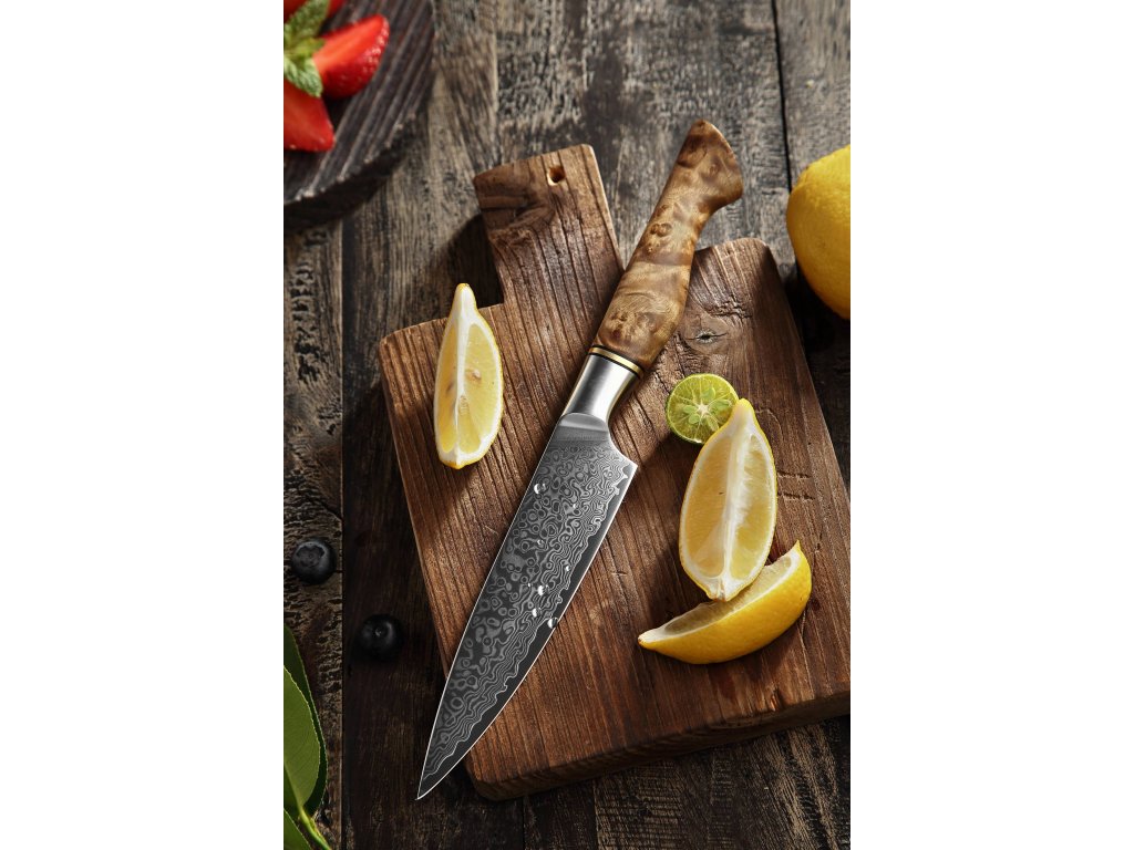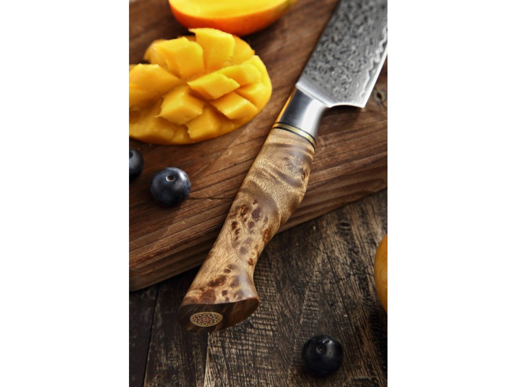 Dieses Gemüsemesser ist aus hochwertigem Damaszener Stahl gefertigt, der für die Herstellung der besten Messer verwendet wird. Die Messerklinge mit einer Härte von 60±2 Rockwell besteht aus 67 Lagen. Hochwertiger Stahl in einer Kombination von traditioneller Herstellung garantiert eine lange Lebensdauer des Messers. Seine Oberfläche bietet Komfort beim Schneiden, ohne dass es reibt oder dass die Zutaten an die Klinge pappen. Der Farbton des Musters auf der Klinge kann unterschiedlich sein, da jedes Messer durch das Stahlschichten einzigartig ist.