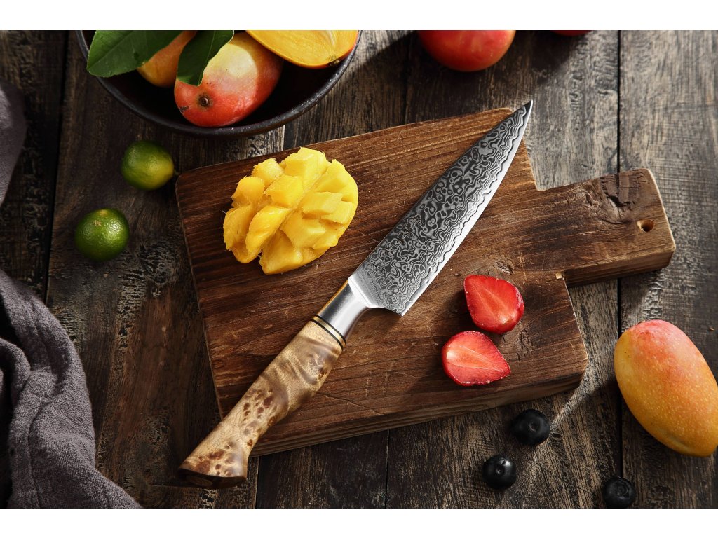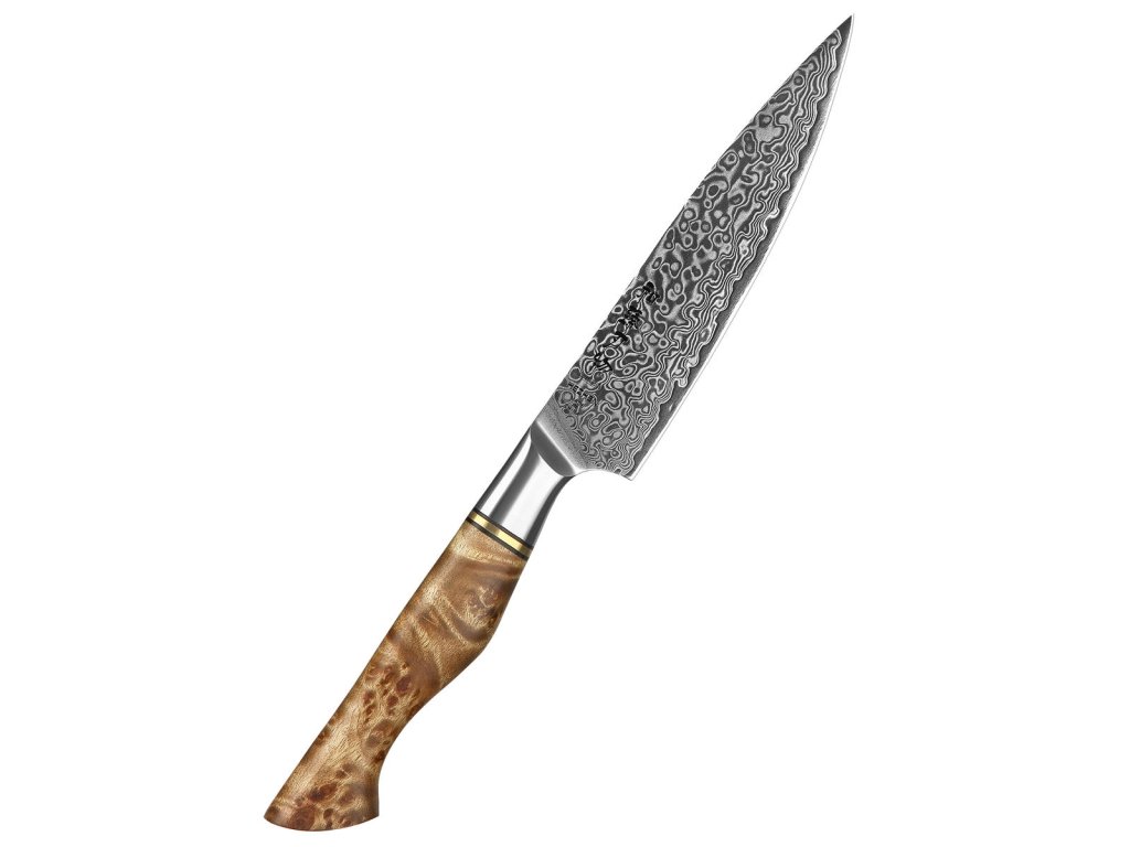 Obst- und Gemüsemesser HEZHEN Master B30, 13 cm für komfortables Schneiden mit handgefertigter Damastklinge und ergonomischem Designgriff aus Holz.