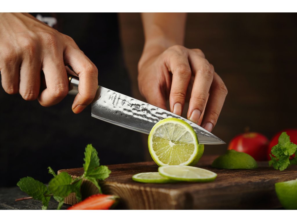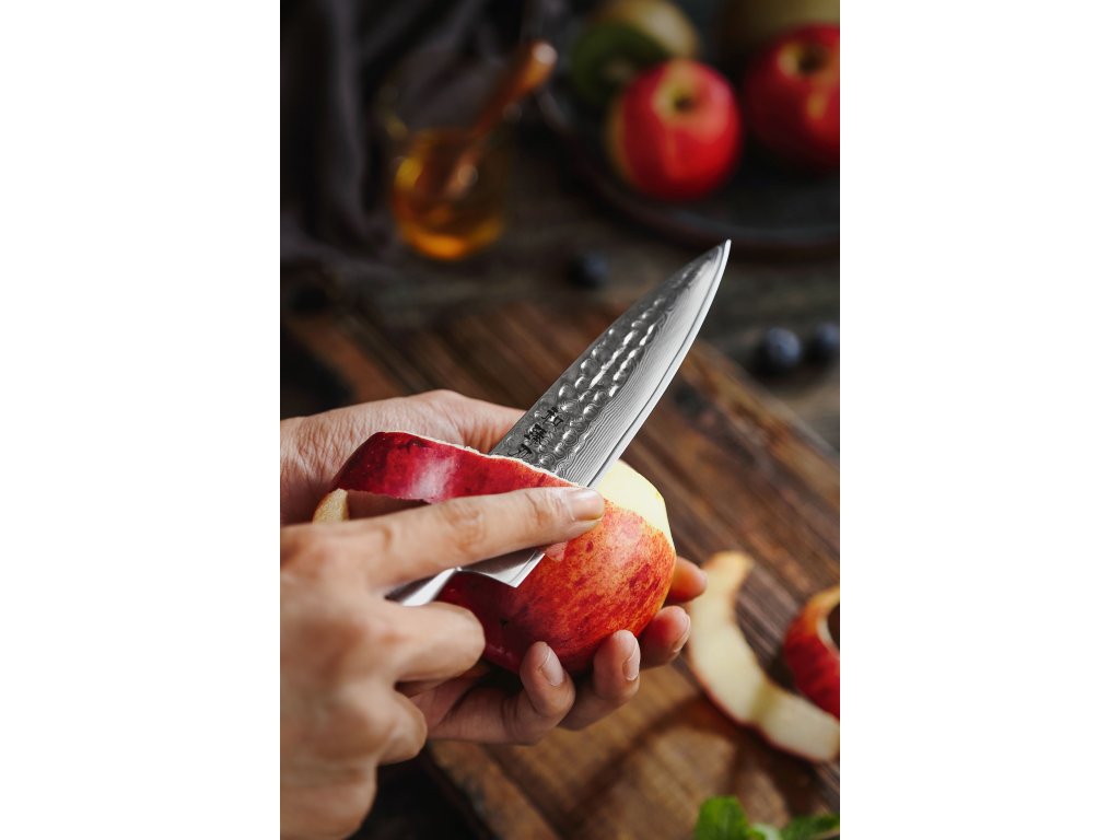 Obst- und Gemüsemesser - Präzises Schneiden ohne Saftverlust. Dieses Messer eignet sich mit seiner kurzen Klinge für präzises Schneiden von Obst und Gemüse. Dank der kompakten Klingengröße lassen sich auch kleinere Zutaten problemlos bearbeiten. Sie lassen sich gleichmäßig und präzise schneiden, ohne Faltenbildung, Beschädigung oder unnötigen Verlust von vitaminreichen Säften. Mit der von unseren Messerschmieden handgeschliffenen Klinge können Sie Obst und Gemüse schnell, effizient und ohne Kompromisse zerteilen.