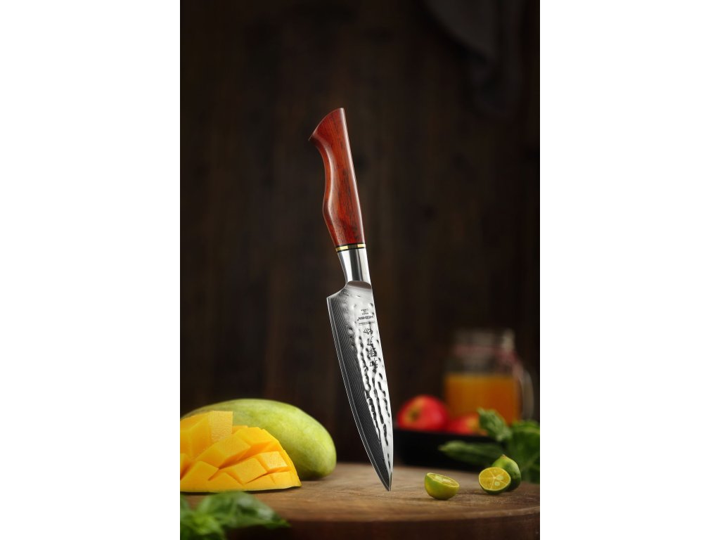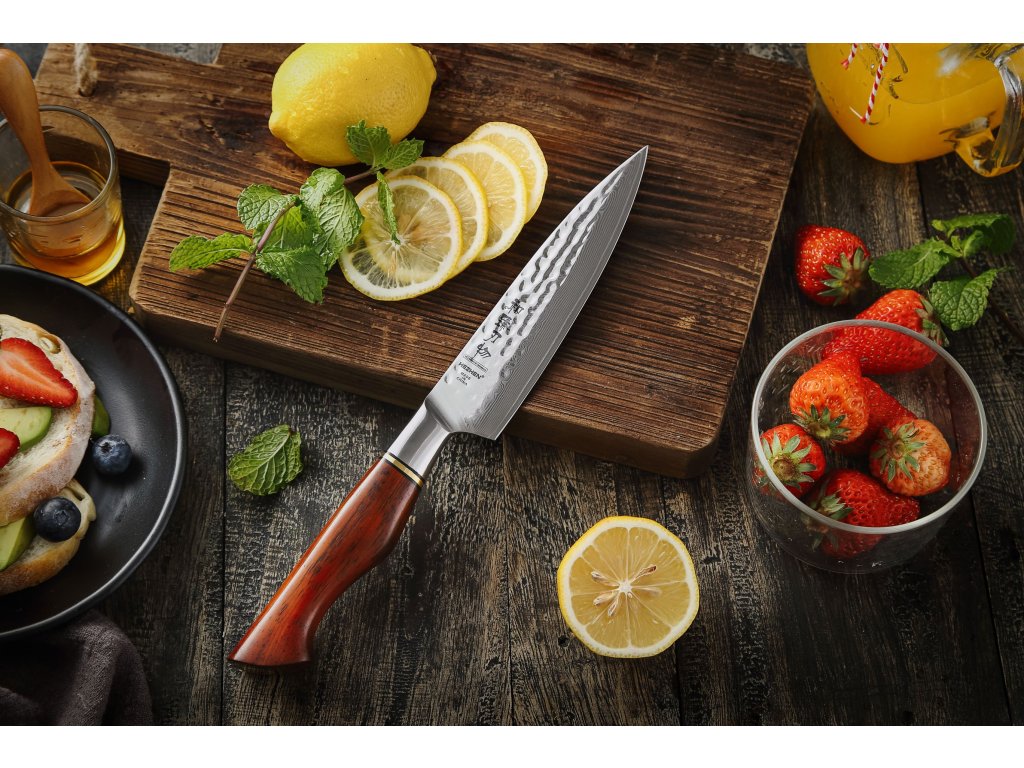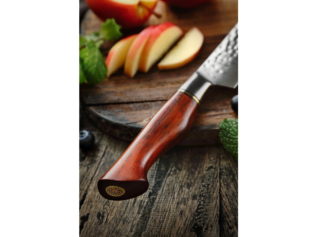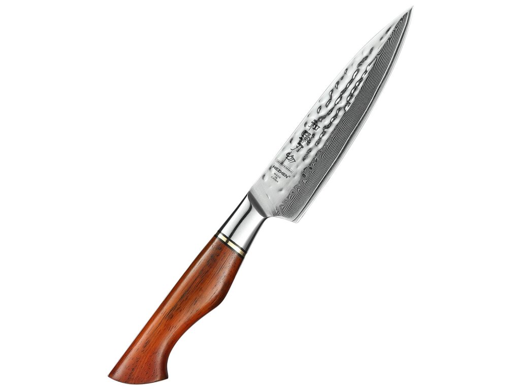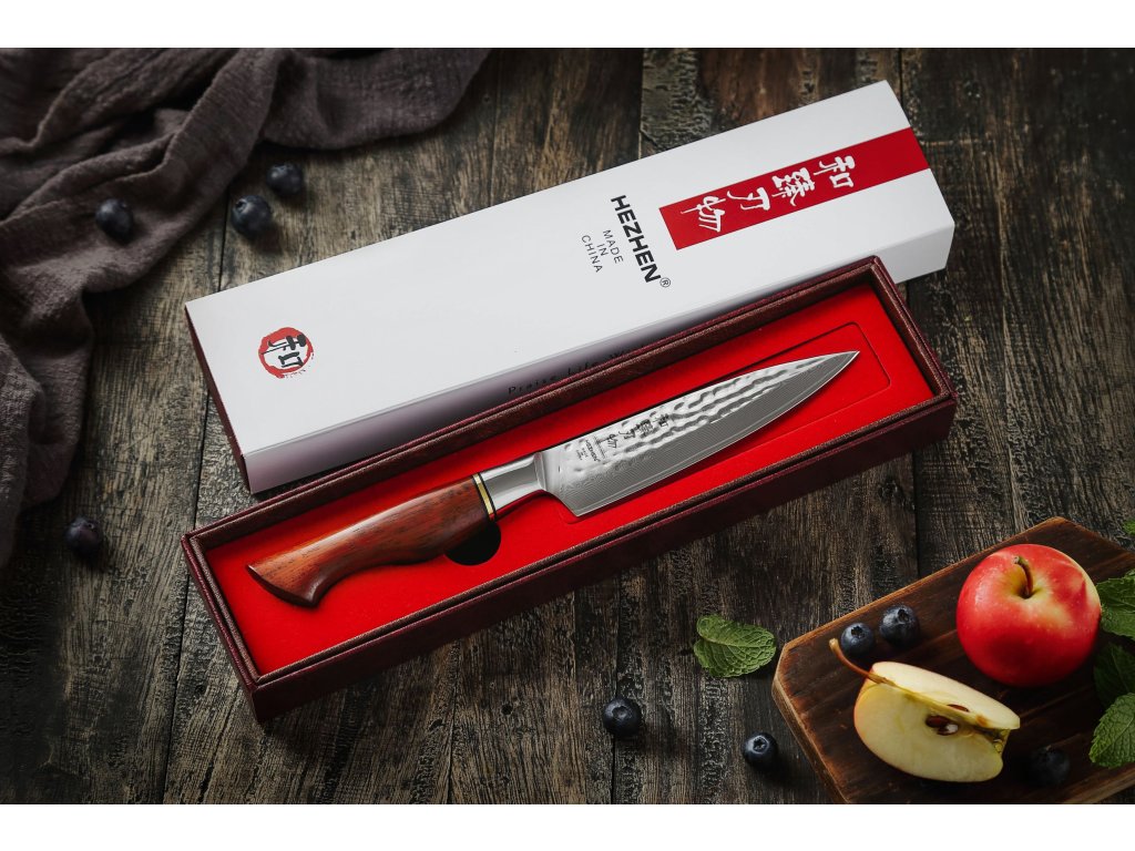 Das Gemüsemesser HEZHEN Master B30R 13 cm bietet komfortables Schneiden mit handgefertigter Damastklinge und ergonomisch geformtem Griff aus Palisanderholz.