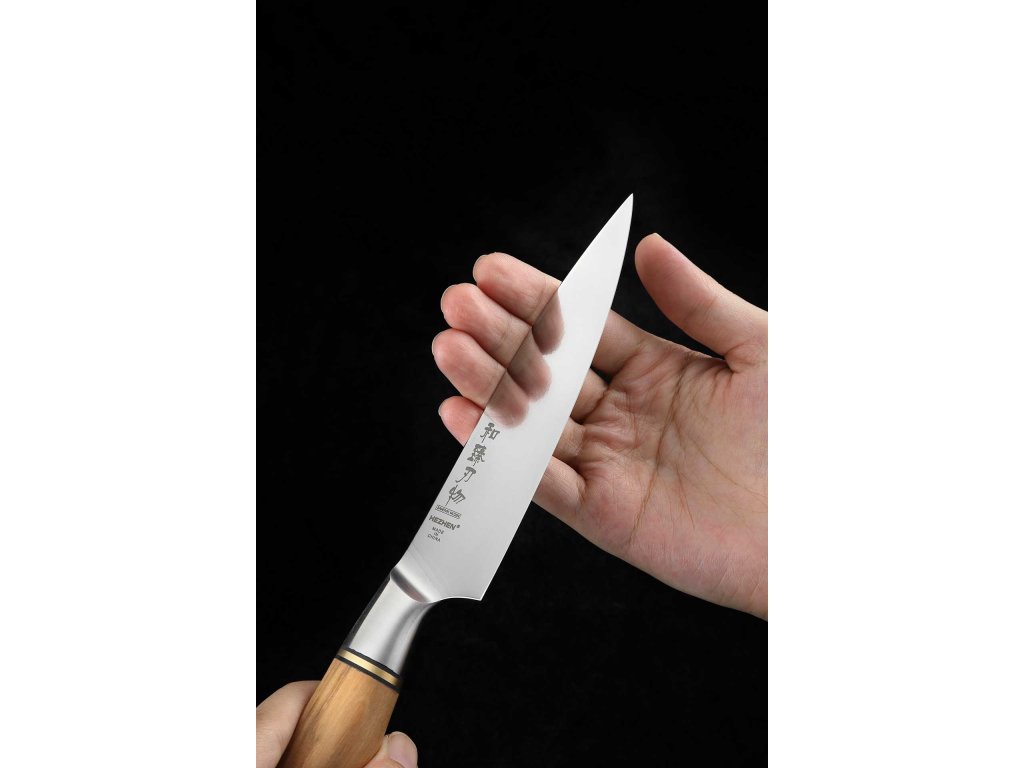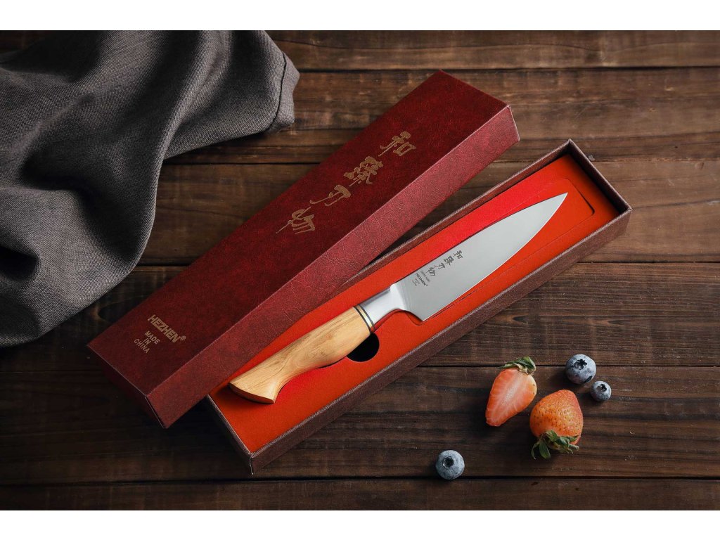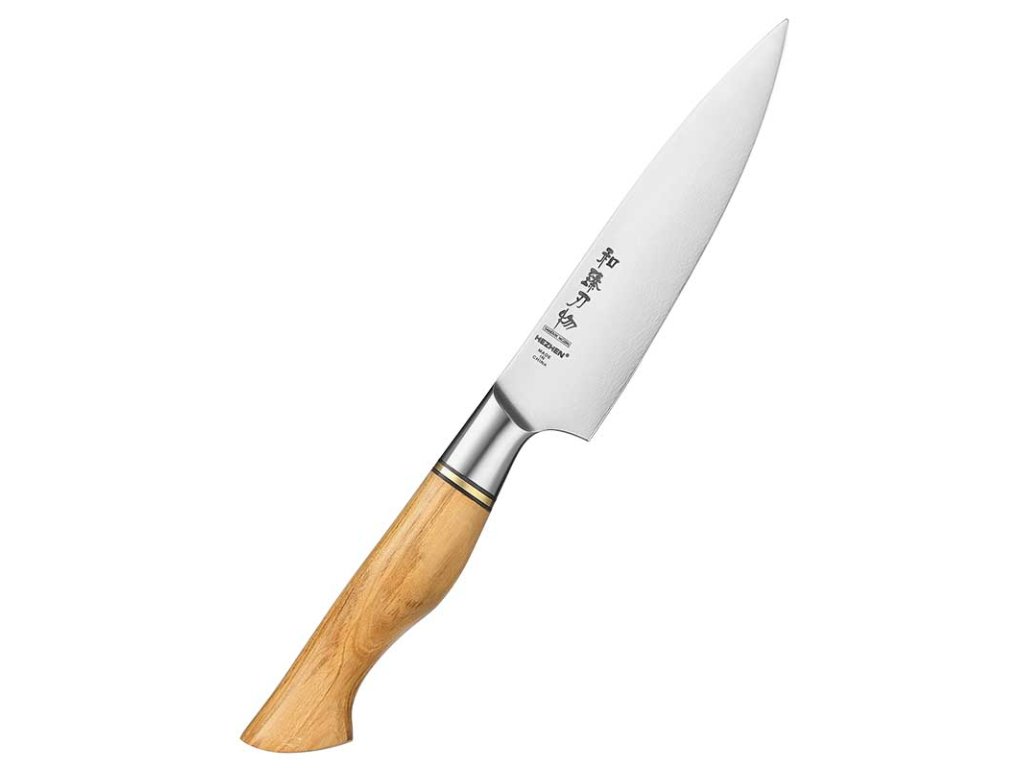 Gemüsemesser HEZHEN Master B30S, 13-cm-Klinge aus hochwertigem schwedischem Sandvik 14C28N Stahl und natürlichem Olivenholzgriff.