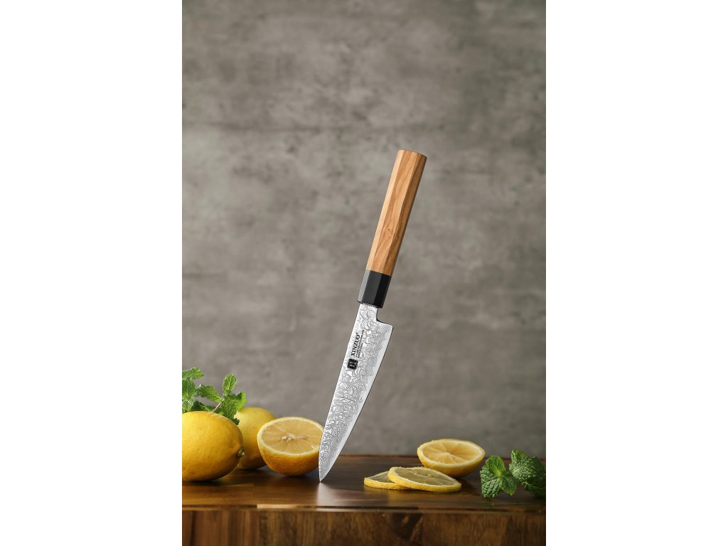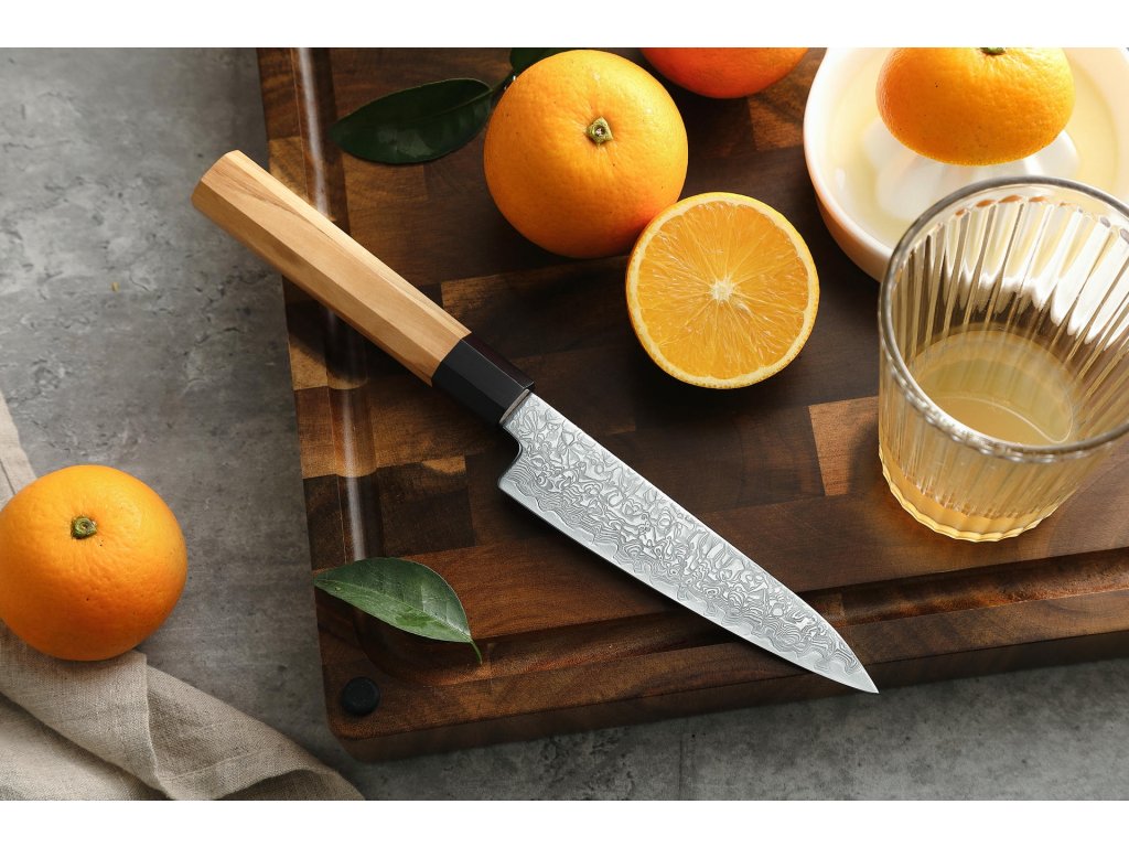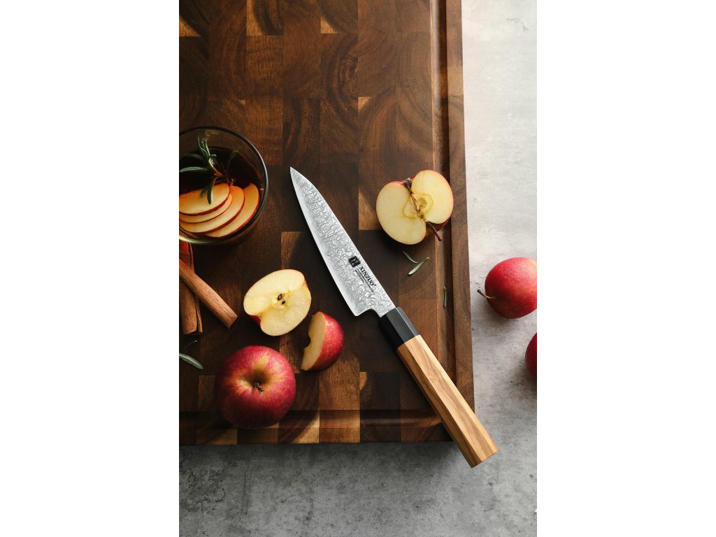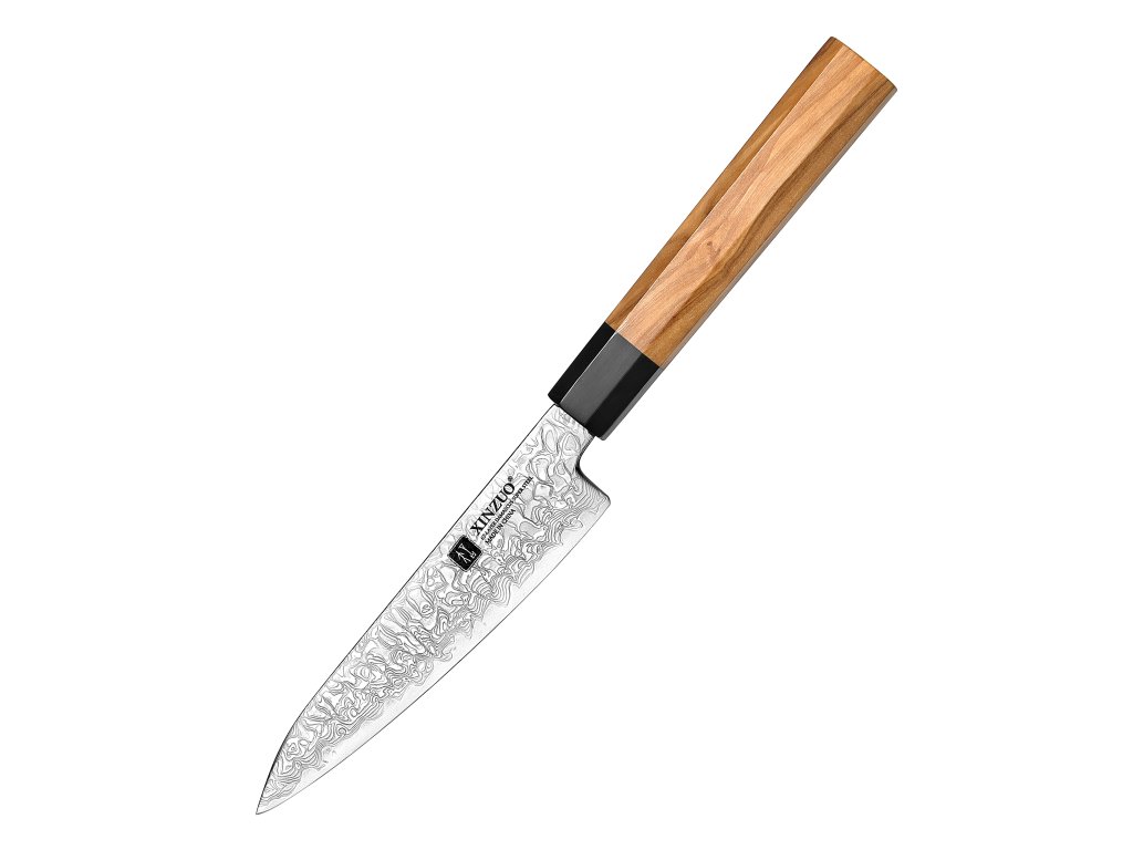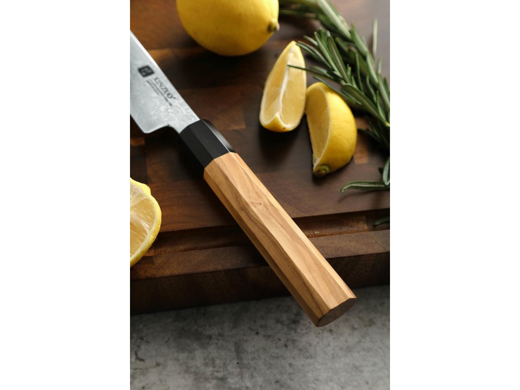 Elegantes Gemüsemesser XinZuo Zhen PM8O mit 14-cm-Klinge aus Damaszener Stahl und achteckigem Griff aus Olivenholz und Büffelhorn im japanischen Stil.
