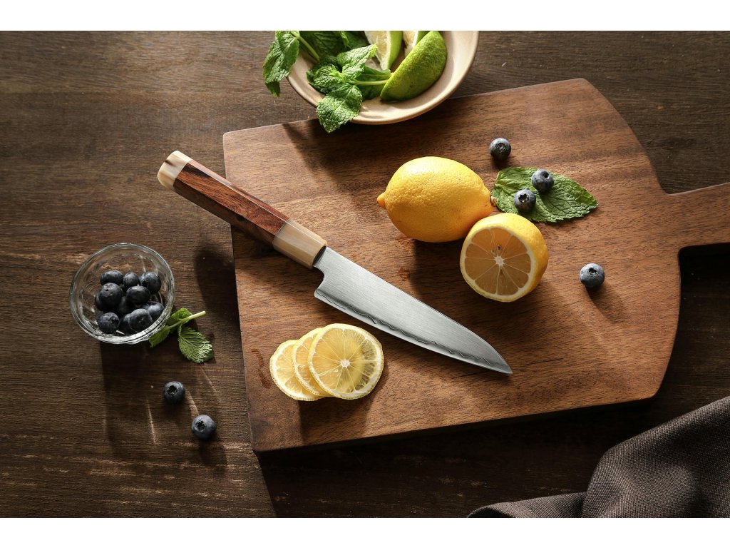 Der im traditionellen achteckigen japanischen Stil gefertigte Griff wurde mit höchster Sorgfalt auf Ergonomie und angenehmen Halt auch bei langem Gebrauch entwickelt. Perfekte Balance und präzise gestaltete Kanten verhindern ein Abrutschen – selbst bei nassen Händen. Durch diese Konstruktion eignet sich das Messer gleichermaßen für Rechts- wie auch für Linkshänder.