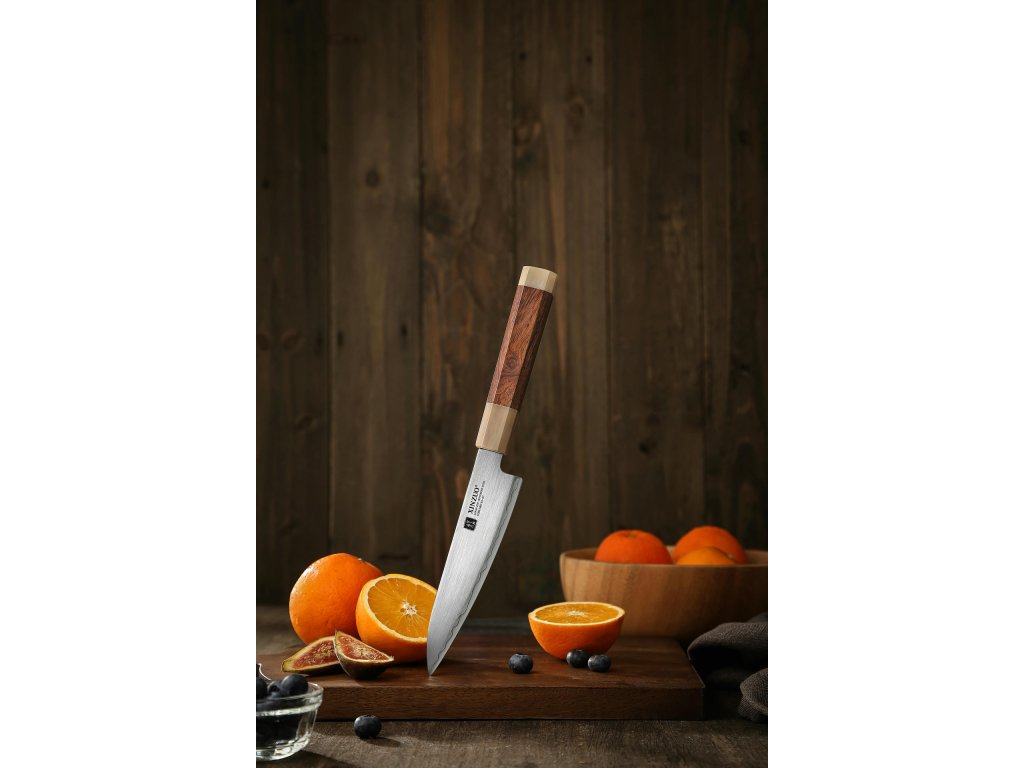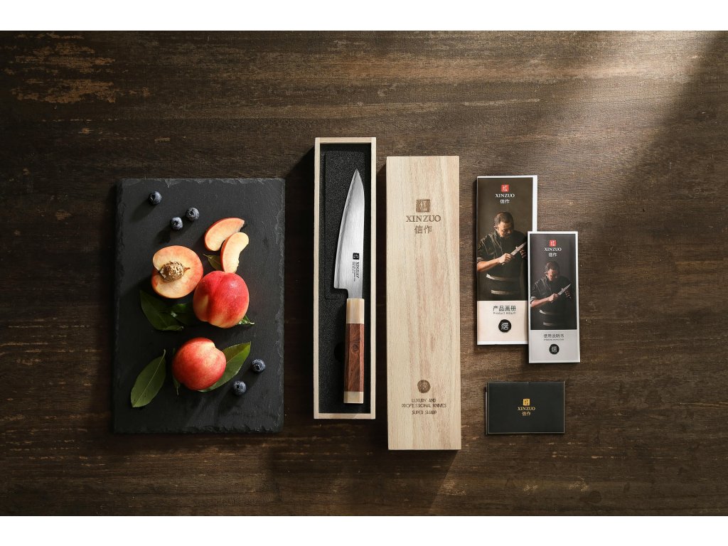 Die Messerserie XinZuo Zhen X05Z ist eine Hommage an den traditionellen japanischen Stil von Küchenmessern und kombiniert diesen mit einem modernen Materialkonzept. Die Klinge zeichnet sich durch japanischen Minimalismus ohne ablenkende Muster aus und besteht aus echtem japanischem ZDP-189 Stahl mit einer überdurchschnittlichen Härte von 65-67 HRC. Dies garantiert eine außergewöhnliche Schärfe. Der traditionelle achteckige Griff, der mit japanischen Messern assoziiert wird, unterstreicht ihr authentisches Aussehen. Mit diesen Messern zu schneiden bedeutet nicht nur Freude, sondern auch Stolz. Die Besonderheit der gesamten Serie krönt eine edle Holzbox.