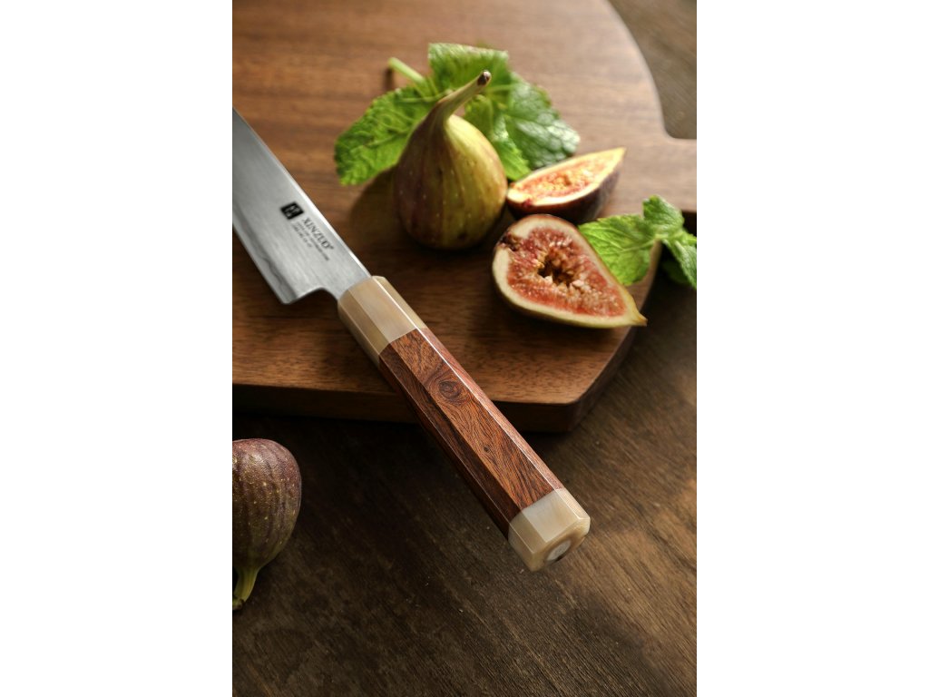 Das luxuriose Gemüsemesser XinZuo Zhen X05Z 14 cm mit einer Klinge aus japanischem Stahl und einem traditionellen achteckigen Griff, wird in einer eleganten Holzbox geliefert.