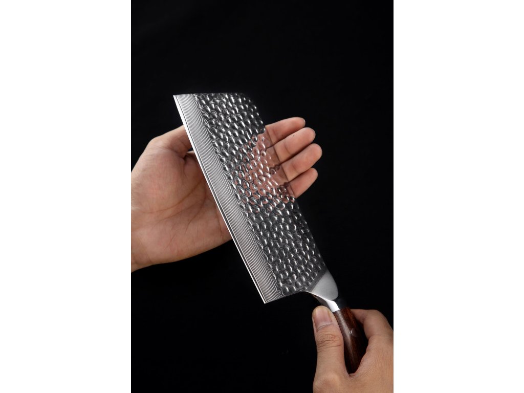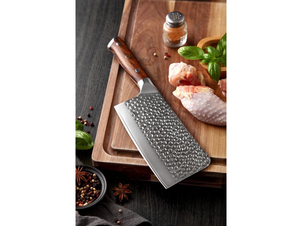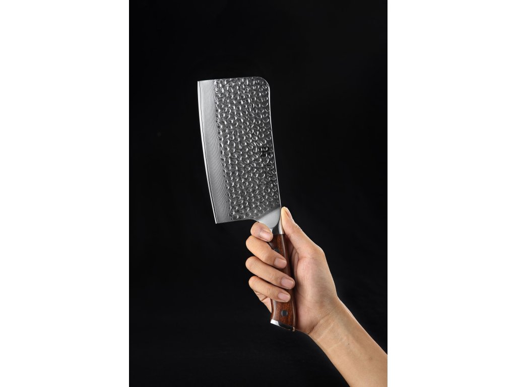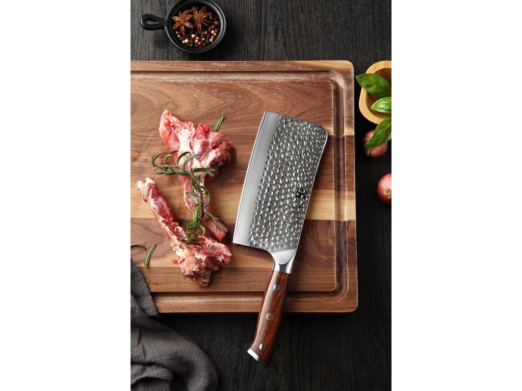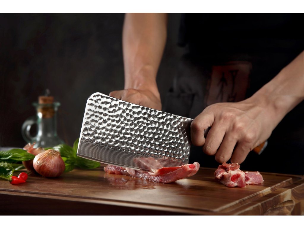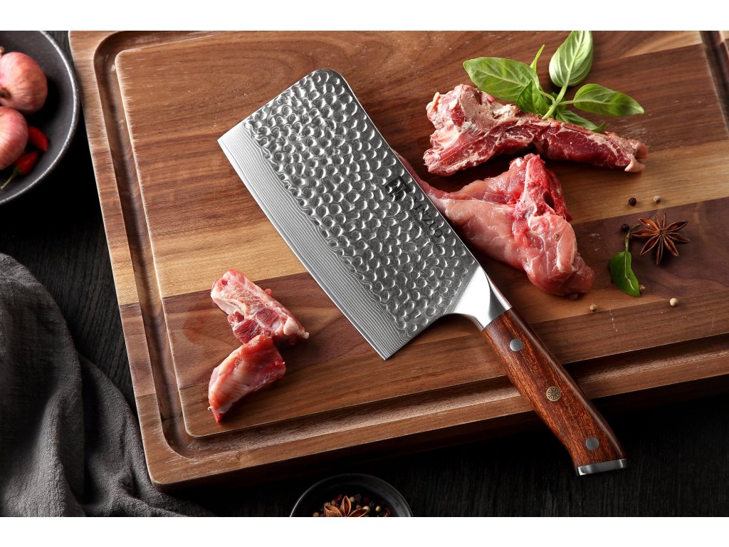 Mit dem hochwertigen XinZuo Yu B13D Hackmesser mit Klinge aus Damaszenerstahl können Sie sogar Rippenknochen zerkleinern, ohne dass diese splittern.