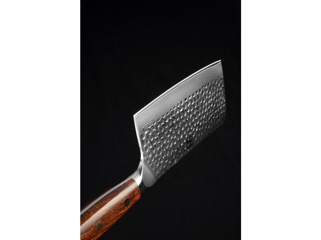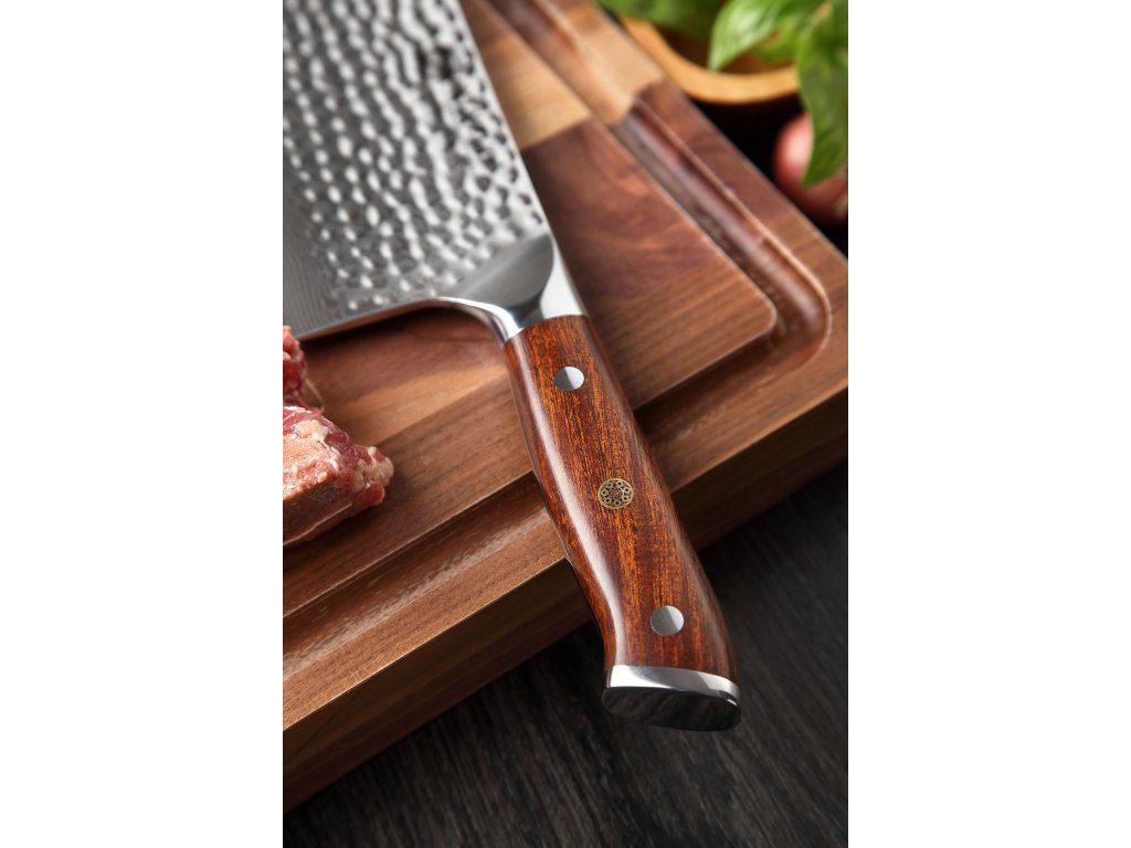 Dieses Fleischerbeil ist aus hochwertigem Damaszener Stahl gefertigt, der für die Herstellung der besten Messer verwendet wird. Die Messerklinge mit einer Härte von 60±2 Rockwell besteht aus 67 Lagen. Hochwertiger Stahl in einer Kombination von traditioneller Herstellung garantiert eine lange Lebensdauer des Messers. Die Oberfläche des Messers bietet beim Schneiden Komfort, ohne dass es reibt oder dass die Zutaten an die Klinge pappen. Der Griff des Messers ist aus IronWood gefertigt, das aus den Wüstenregionen Nordamerikas gewonnen wird. Es zeichnet sich durch hohe Härte und Stabilität aus. Dank seiner perfekten Form und Länge wird das Schneiden zum Vergnügen und außerdem liegt das Messer gut in der Hand. Aufgrund des natürlichen Griff-Designs kann die Farbe und das Design leicht von den Produktbildern abweichen, da der Griff aus einem anderen Holzstück gefertigt wurde oder da das Alter des Holzes unterschiedlich ist. Der Farbton des Musters auf der Klinge kann unterschiedlich sein, da jedes Messer durch das Stahlschichten einzigartig ist.