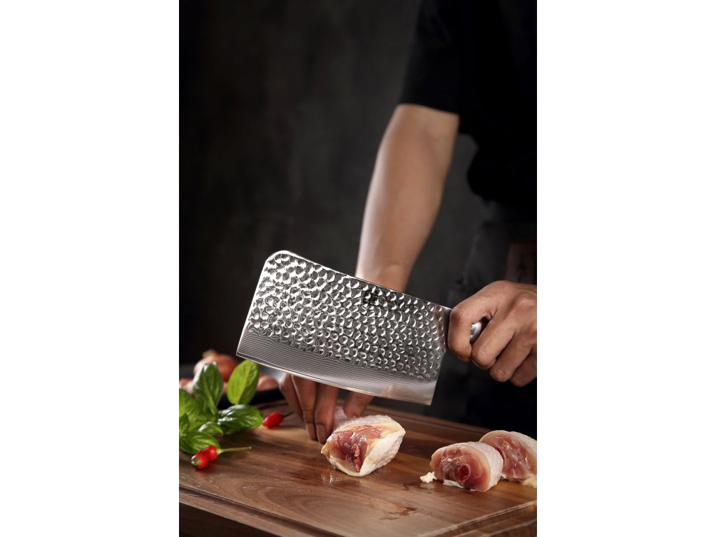 Hackmesser - Nicht nur zum Tranchieren von Geflügel. Das Hackmesser ist ein unverzichtbares Werkzeug beim Schneiden von Geflügel, großen Fleischstücken mit Knochen und hartem Wurzelgemüse. Es ist zum Hacken geeignet, nicht zum normalen Schneiden von Zutaten. Die Form des Hackmessers ermöglicht ein effizientes und sicheres Zerkleinern, während die breite Klinge auch zum bequemen Übertragen der zerkleinerten Zutaten dient. Dank seines geringen Gewichts ist nur minimaler Kraftaufwand nötig und ist somit das ideale Werkzeug für müheloses und präzises Schneiden und Hacken.