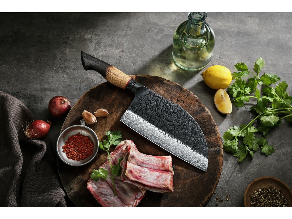 Dieses Hackmesser ist aus hochwertigem Damaszener Stahl gefertigt, der für die Herstellung der besten Messer verwendet wird. Die Messerklinge mit einer Härte von 56-58 Rockwell besteht aus 67 Lagen. Hochwertiger Stahl in einer Kombination von traditioneller Herstellung garantiert eine lange Lebensdauer des Messers. Die Oberfläche des Messers bietet beim Schneiden Komfort, ohne dass es reibt oder dass die Zutaten an die Klinge pappen. Die Messer werden beiderseitig von Messerschmieden von Hand mit einem Winkel von 27 ± 1° geschliffen.