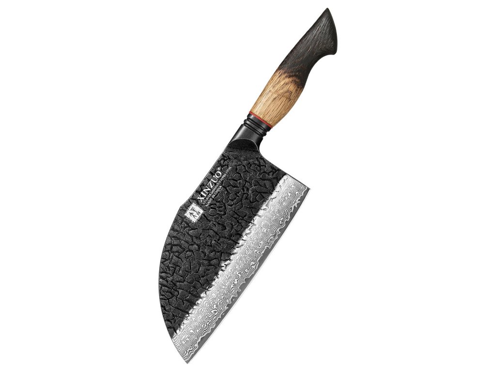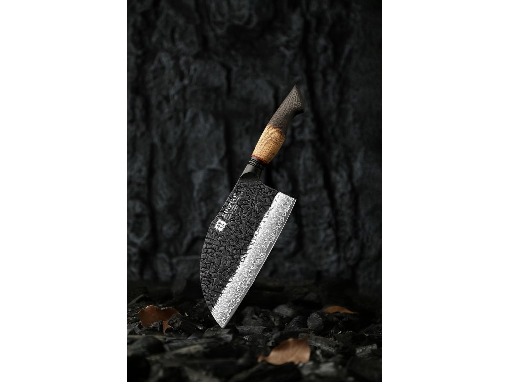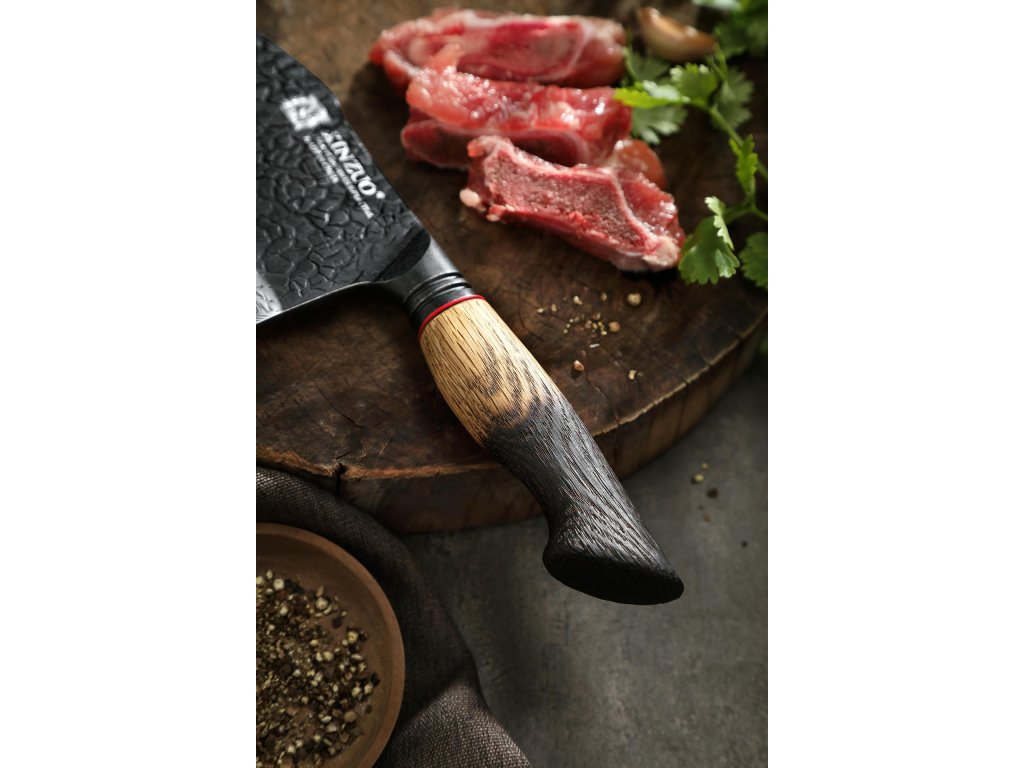 Hackmesser XinZuo Mo X06 19 cm mit einzigartiger Damastklinge und handgefertigtem Eichenholzgriff, der fließend von einer hellen, warmen Farbe zu einer rauchigen, dunklen übergeht.