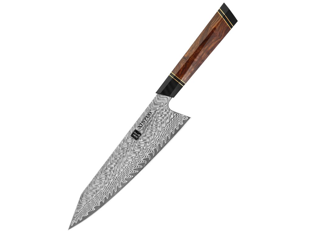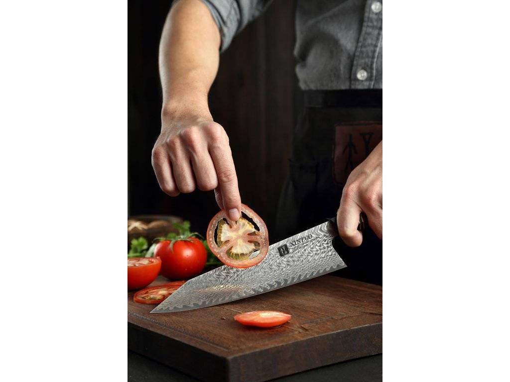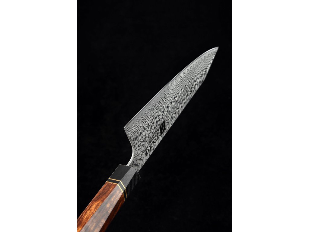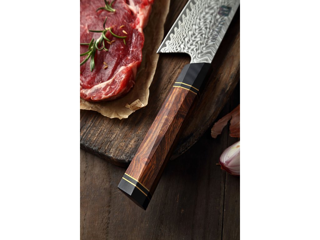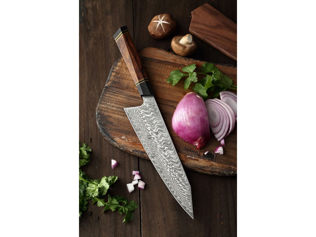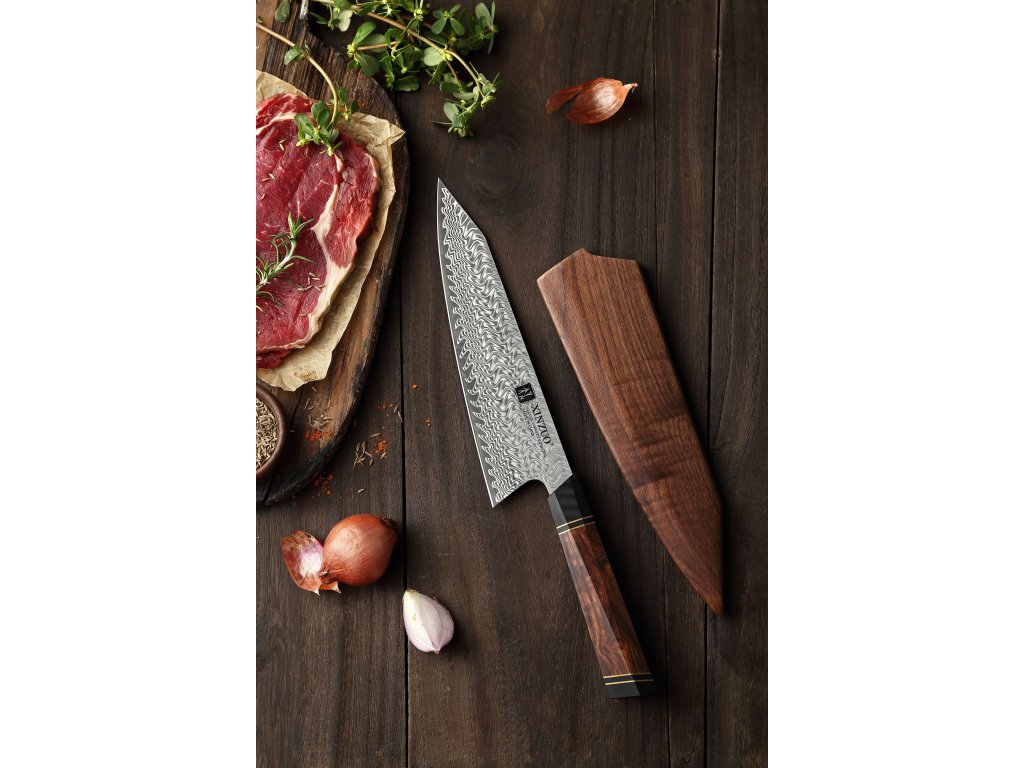 Spezielles Kochmesser Bunka im japanischen Stil aus Damaszener Stahl mit ergonomischem Design-Griff. Das Paket enthält auch eine elegante Holzscheide für die Messerklinge.