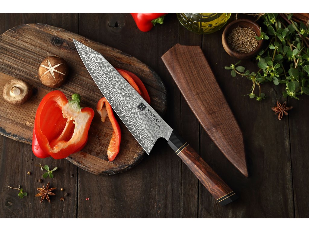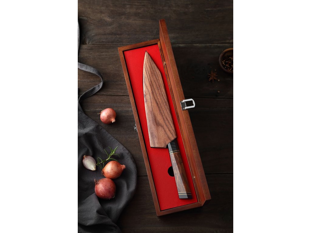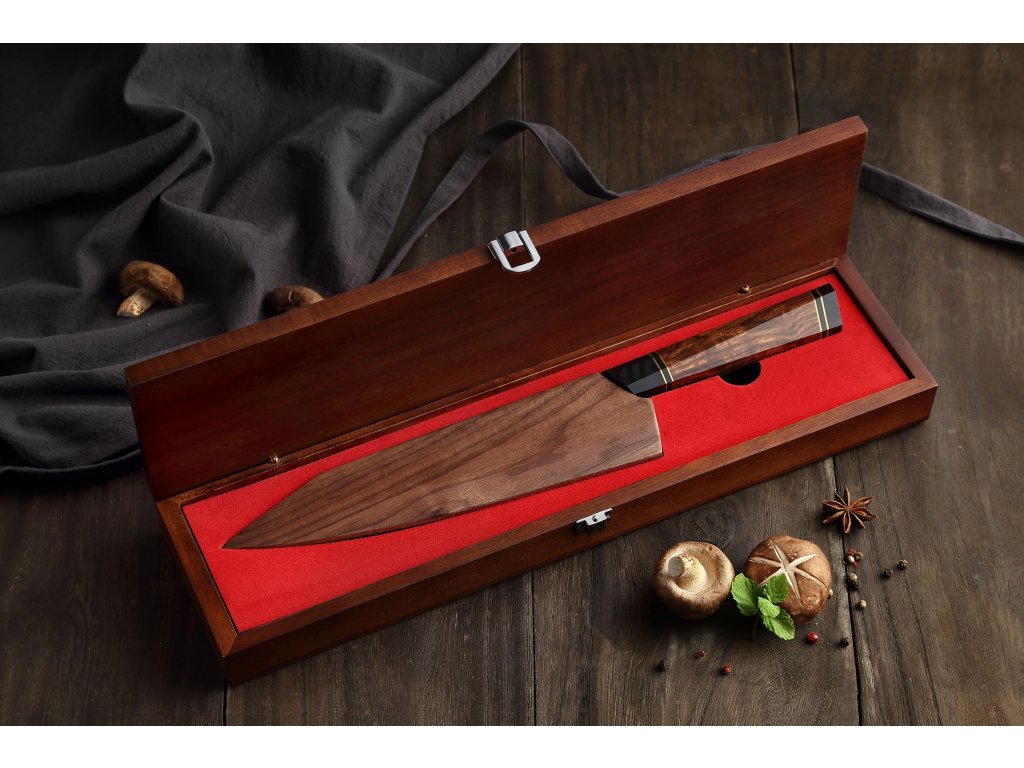 Das Kochmesser Bunka von XinZuo im japanischen Stil ist in einer luxuriösen Geschenkbox aus Holz verpackt, die seine Einzigartigkeit unterstreicht. Dank der Geschenkbox gilt es als ein praktisches Geschenk für den Haushalt zu verschiedensten Anlässen, und auch als praktisches luxuriöses Geschenk für Geschäftspartner. Das luxuriöse Design der Holzbox und das hochwertige Bunka Messer von XinZuo wird jedem Beschenkten Freude machen. Das Paket enthält auch eine elegante Holzscheide für die Messerklinge.