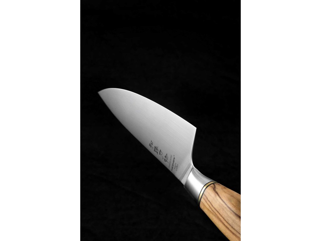 Die Messerklinge erreicht eine Härte von 58±1 Rockwell und ist hochglanzpoliert und sandgestrahlt für erhöhte Kratzfestigkeit. Die Klinge des Messers wird von Messerschmieden auf beiden Seiten in einem Winkel von 15° wird traditionell von Hand nassgeschliffen. Der so genannte goldene Schleifwinkel (15°) bietet die perfekte Balance zwischen Schärfe und Haltbarkeit der Messerklinge.