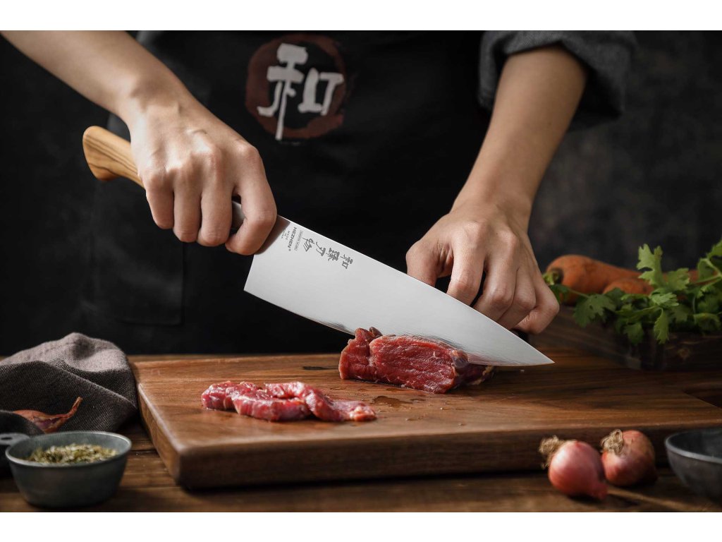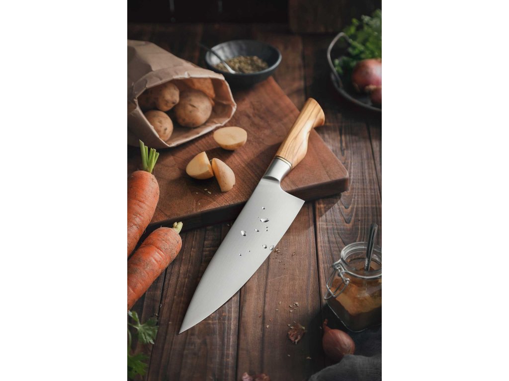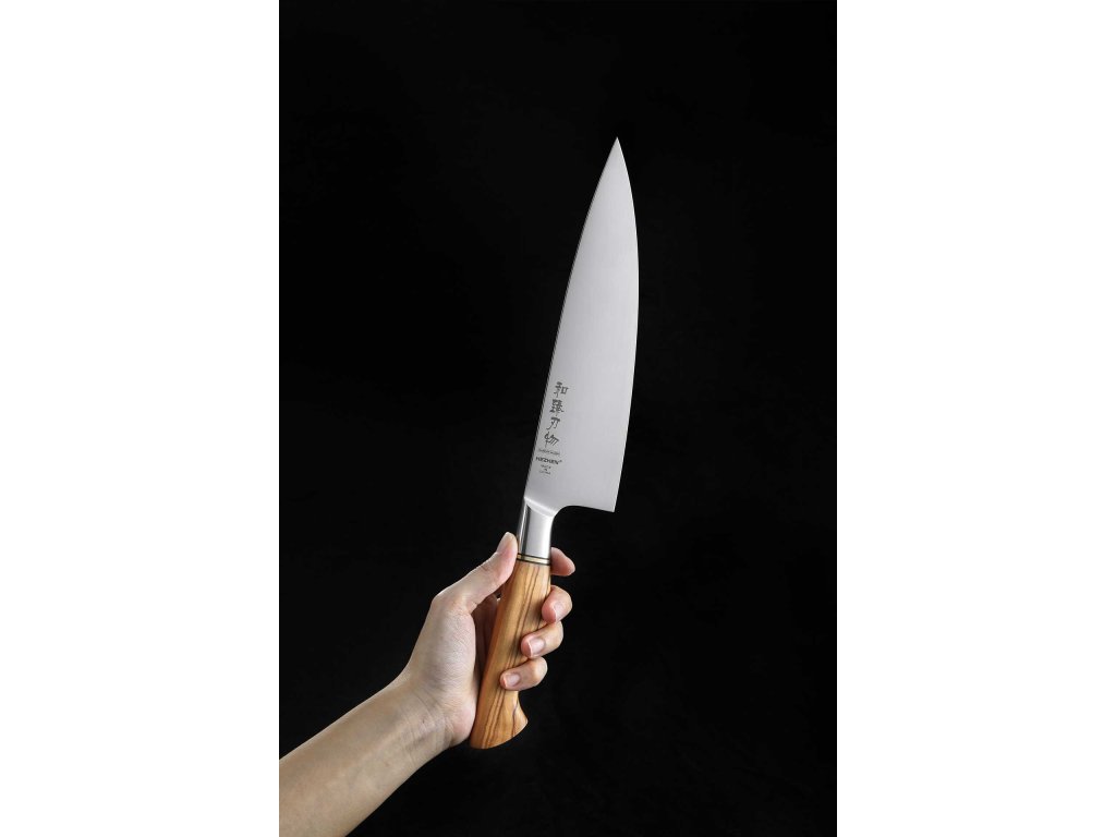 Kochmesser HEZHEN Master B30S mit 21 cm Klinge aus hochwertigem schwedischen Sandvik 14C28N Stahl und natürlichem Olivenholzgriff.
