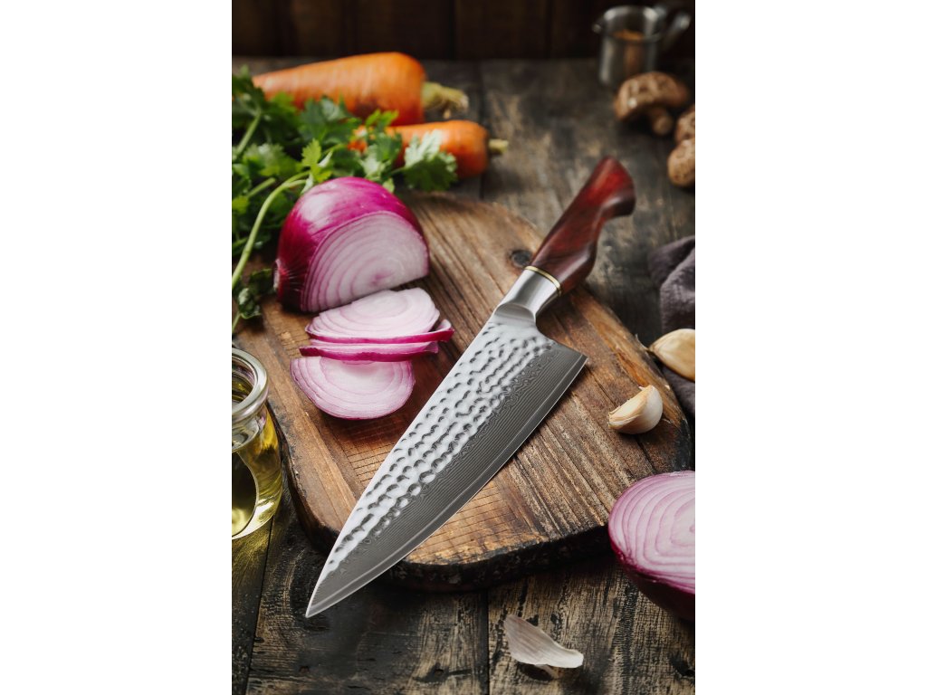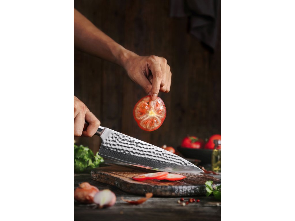 Dieses Chefmesser ist aus hochwertigem Damaszener Stahl gefertigt, der für die Herstellung der besten Messer verwendet wird. Deren Messerklinge mit einer Härte von 62-64 Rockwell besteht aus 73 Lagen. Der Messerkern ist aus Damaszener Stahl 14Cr14MoVNb gefertigt.