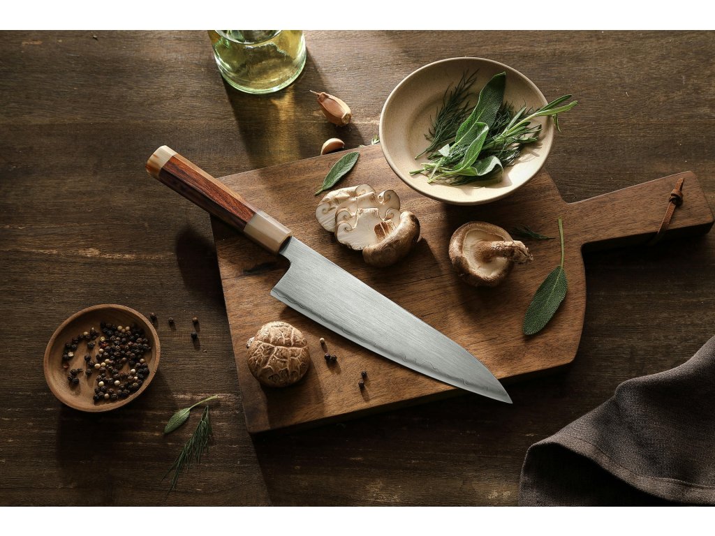 Der im traditionellen achteckigen japanischen Stil gefertigte Griff wurde mit höchster Sorgfalt auf Ergonomie und angenehmen Halt auch bei langem Gebrauch entwickelt. Perfekte Balance und präzise gestaltete Kanten verhindern ein Abrutschen – selbst bei nassen Händen. Durch diese Konstruktion eignet sich das Messer gleichermaßen für Rechts- wie auch für Linkshänder.