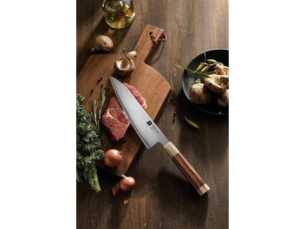 Das luxuriose Kochmesser XinZuo Zhen X05Z 21 cm mit einer Klinge aus japanischem Stahl und einem traditionellen achteckigen Griff, wird in einer eleganten Holzbox geliefert.