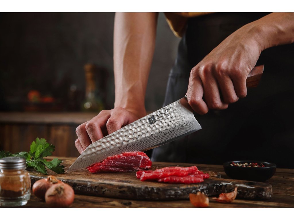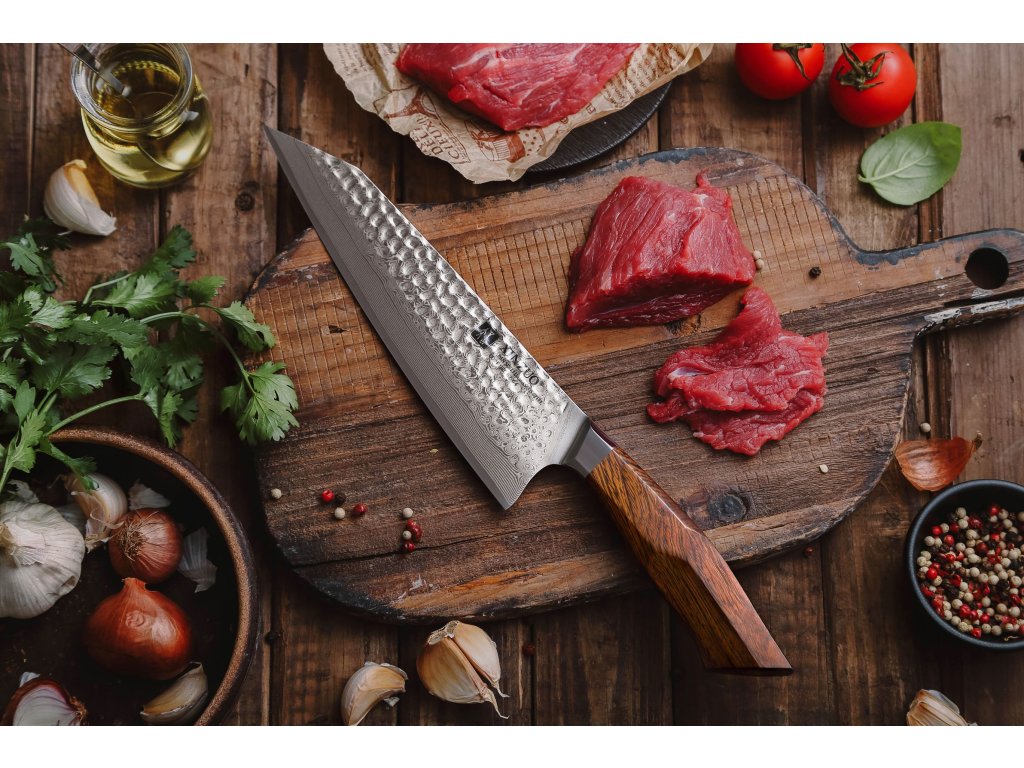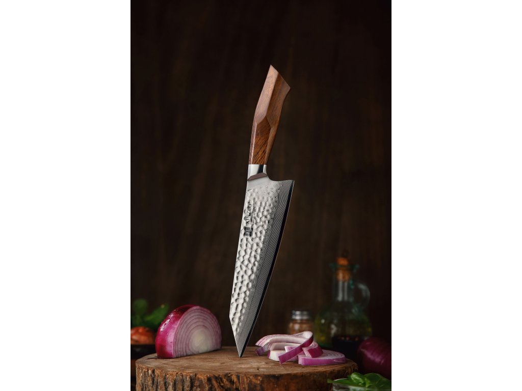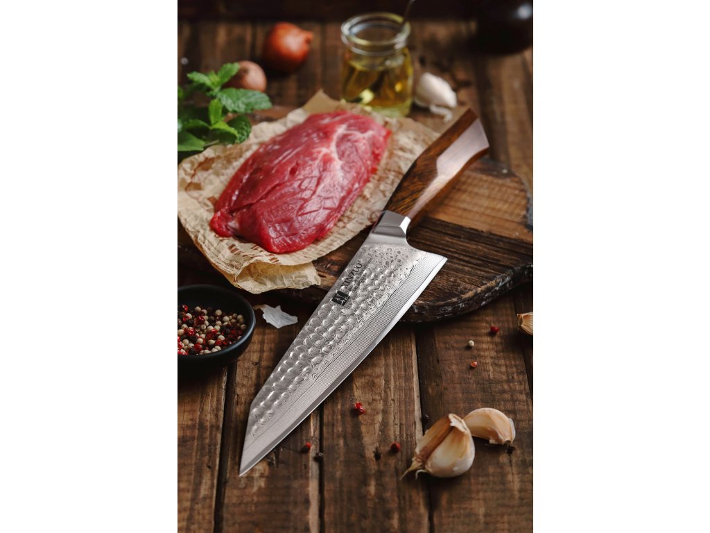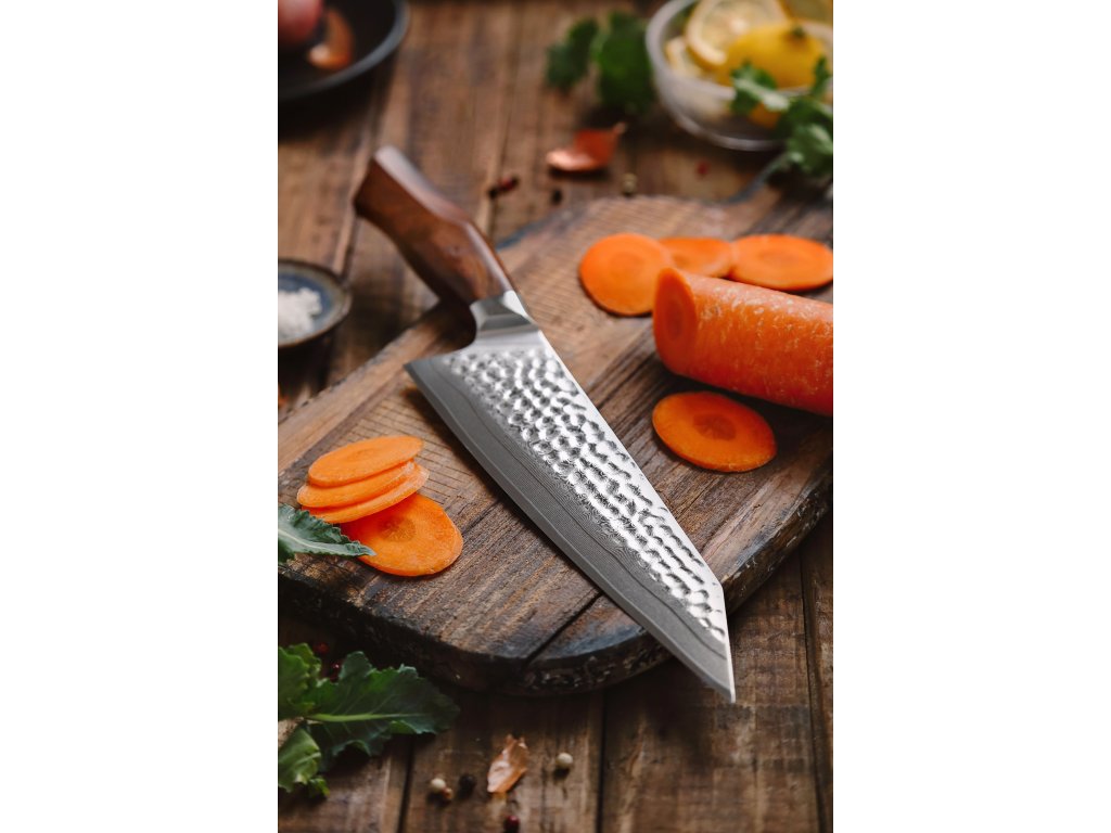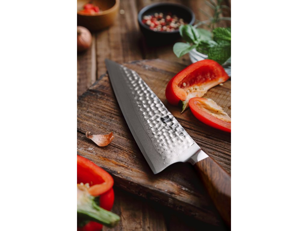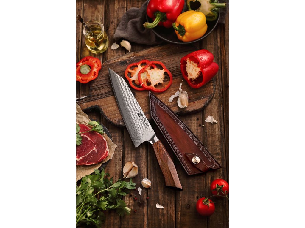 Der Korrosionsschutz wird durch den Edelstahl SUS420J2 gewährleistet, in den der Kern des Messers eingebettet ist. Hochwertiger Stahl in einer Kombination von traditioneller und moderner Herstellung garantiert eine lange Lebensdauer des Messers. Die Oberfläche des Messers bietet beim Schneiden Komfort, ohne dass es reibt oder dass die Zutaten an die Klinge pappen. Der Farbton des Musters auf der Klinge kann von den Produktfotos abweichen, da jedes Messer durch das Stahlschichten einzigartig ist.