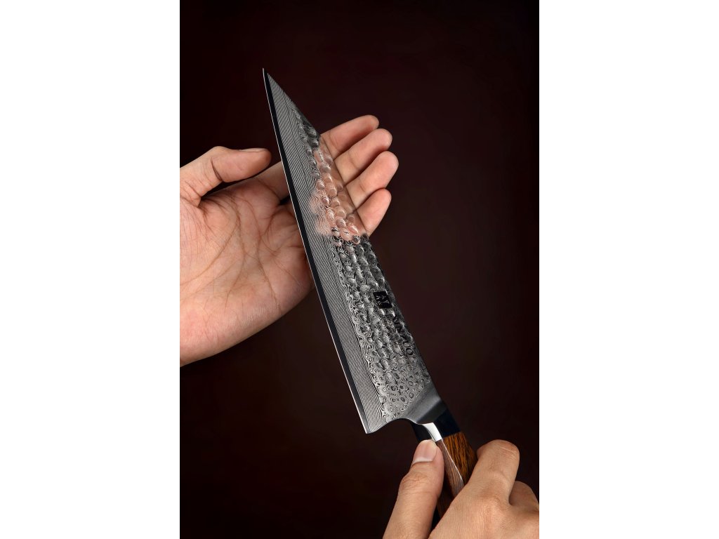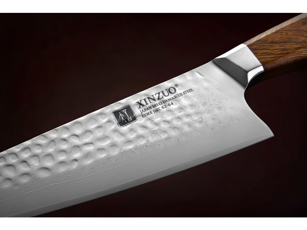 Dieses Kochmesser ist aus hochwertigem japanischem Damaszenerstahl gefertigt, der für die Herstellung der besten Messer verwendet wird. Der verwendete japanische Hitachistahl SRS13 wurde für die Herstellung dieser Messer aus Japan direkt in die chinesische Messerstadt geliefert. Deren Messerklinge mit einer Härte von 62-64 Rockwell besteht aus 49 Lagen. Der Messerkern besteht aus japanischem Stahl Hitachi SRS13.