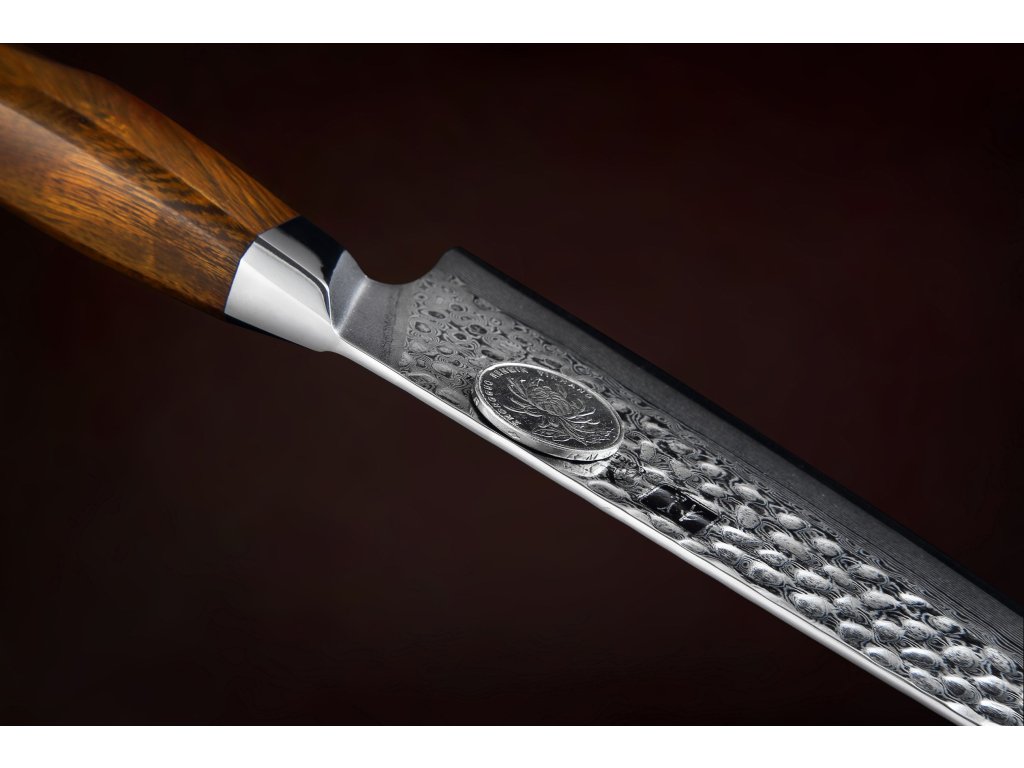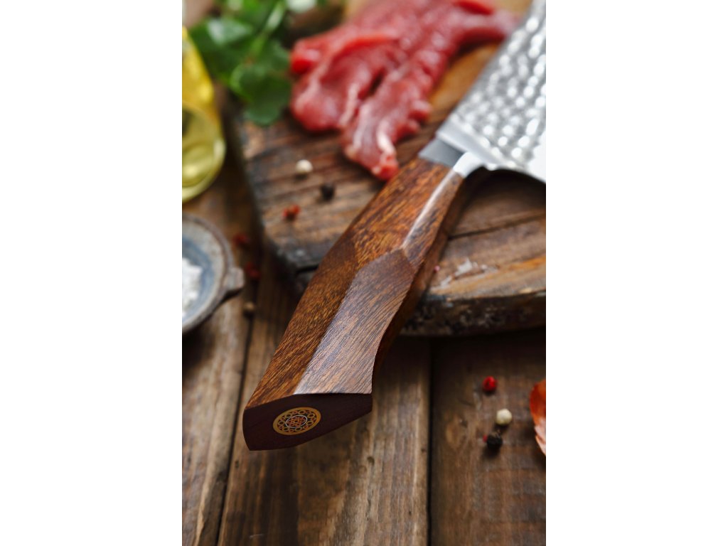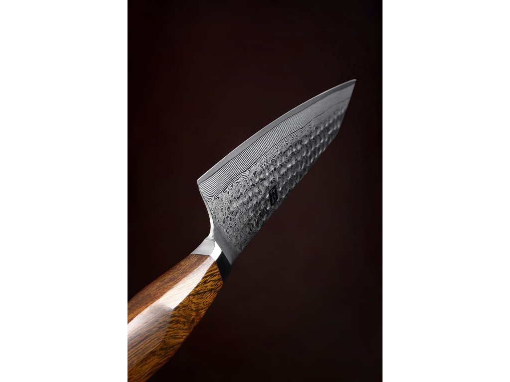 Der Griff der Messerserie XinZuo B32D kann als Kunstwerk betrachtet werden. Er wurde mit dem Schwerpunkt auf Ergonomie und einem bequemen Griff entwickelt. Sie können ihn also auch für längere Zeit bequem und mit perfektem Gleichgewicht halten. Dank der einzigartigen Form und Ergonomie des Griffs werden ihn sowohl Links- also auch Rechtshänder schätzen. Er ist aus hochfestem IronWood gefertigt, das von Bäumen aus den Wüstenregionen Nordamerikas stammt. Es wird mit der Zeit nicht weicher, reißt nicht und erbleicht nicht. Das Messer ist für den täglichen Gebrauch konzipiert und hat eine lange Lebensdauer, wie die Klinge, so auch der Griff. Das einzigartige Griffdesign betont die kunstvolle Mosaikniete. Aufgrund des natürlichen Griff-Designs kann die Farbe und das Design leicht von den Produktbildern abweichen, da der Griff aus einem anderen Holzstück gefertigt wurde oder da das Alter des Holzes unterschiedlich ist.