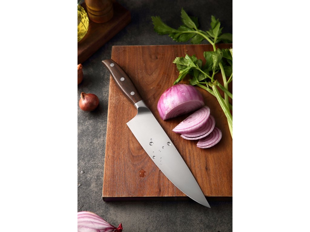 Dieses Kochmesser ist aus hochwertigem deutschem Stahl gefertigt, der für die Herstellung von hochwertigen Messern verwendet wird. Seine Klinge ist eben aus diesem Stahl mit einer Härte von 56-58 Rockwell gefertigt. Hochwertiger Stahl in einer Kombination von traditioneller Herstellung garantiert eine lange Lebensdauer des Messers. Die Oberfläche des Messers bietet beim Schneiden Komfort, ohne dass es reibt oder dass die Zutaten an die Klinge pappen. Der Messergriff ist aus hochwertigem Sandelholz gefertigt, das mit der Zeit weder weicher wird noch einen Geruch annimmt. Dank seiner perfekten Form und Länge wird das Schneiden zum Vergnügen und außerdem liegt das Messer gut in der Hand. Aufgrund des natürlichen Griff-Designs kann die Farbe und das Design leicht von den Produktbildern abweichen, da der Griff aus einem anderen Holzstück gefertigt wurde oder da das Alter des Holzes unterschiedlich ist.