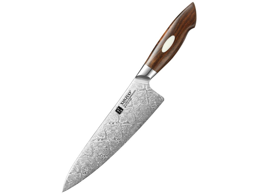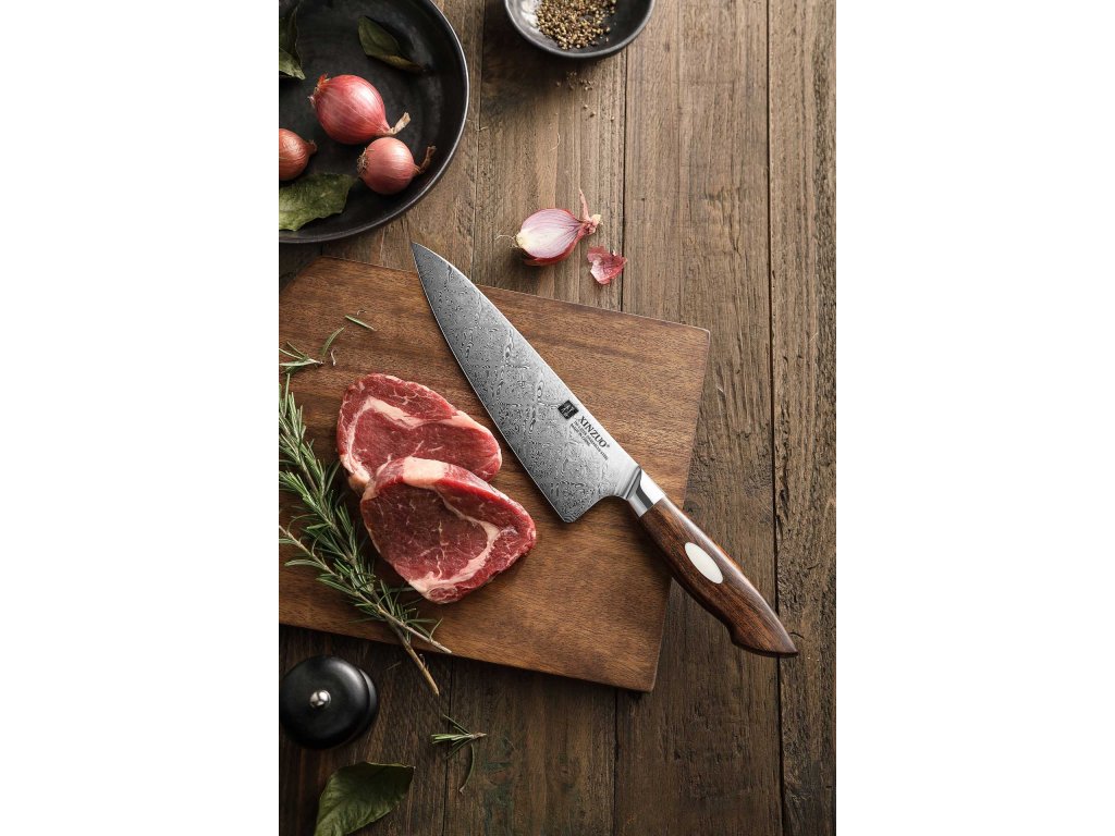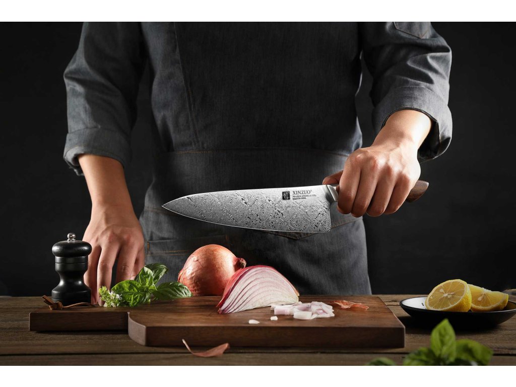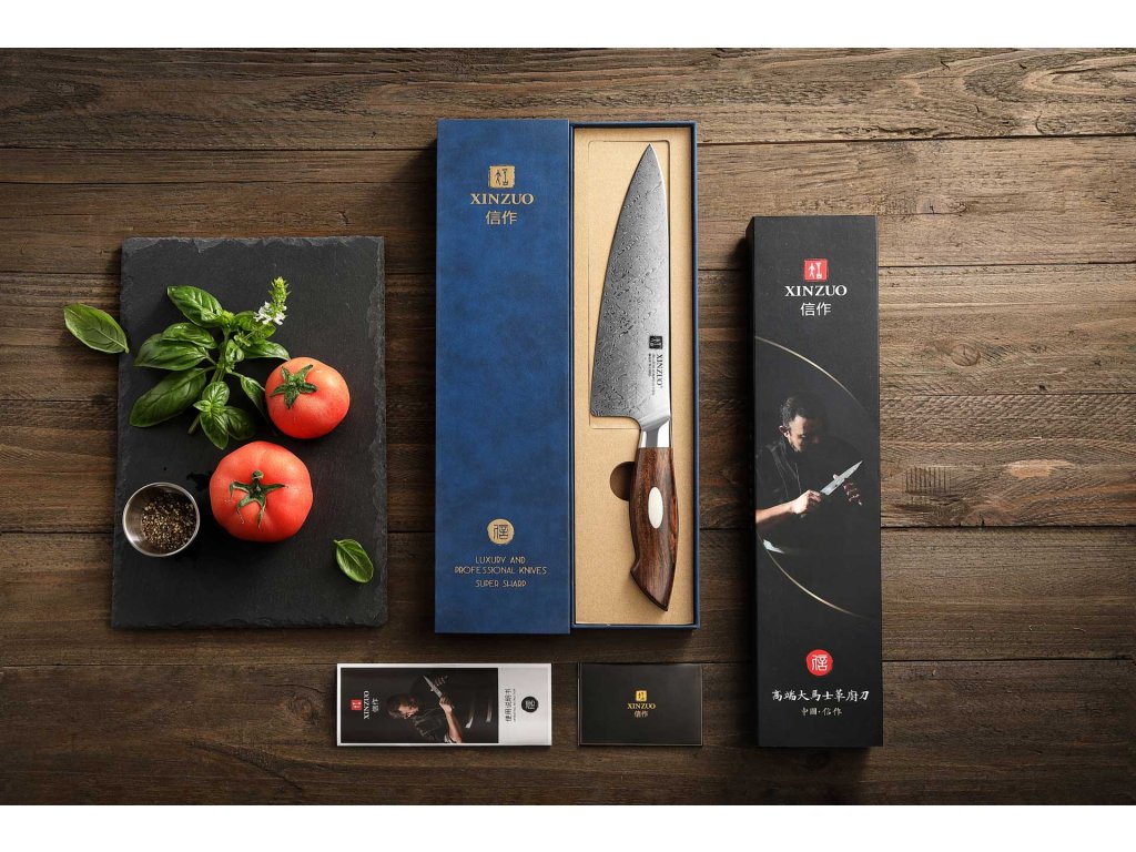 Handgefertigtes Damast-Kochmesser XinZuo aus der Serie B46D mit einzigartiger Klinge aus zwei verschiedenen Damaststählen und Hartholzgriff in einer Geschenkbox.