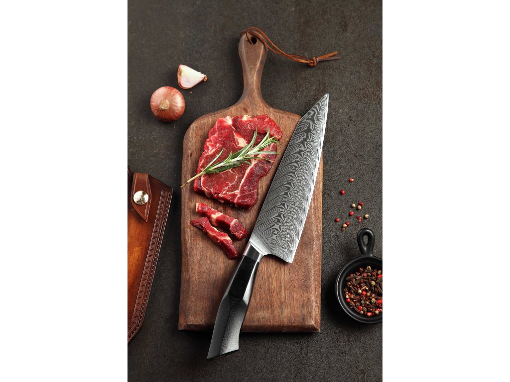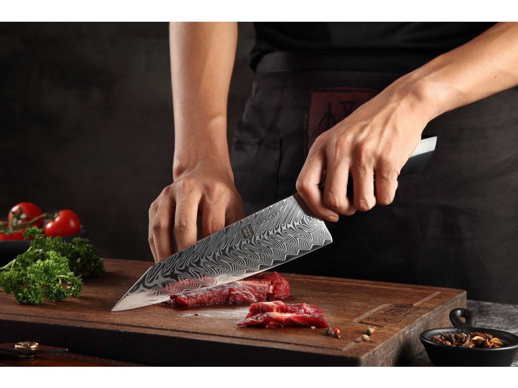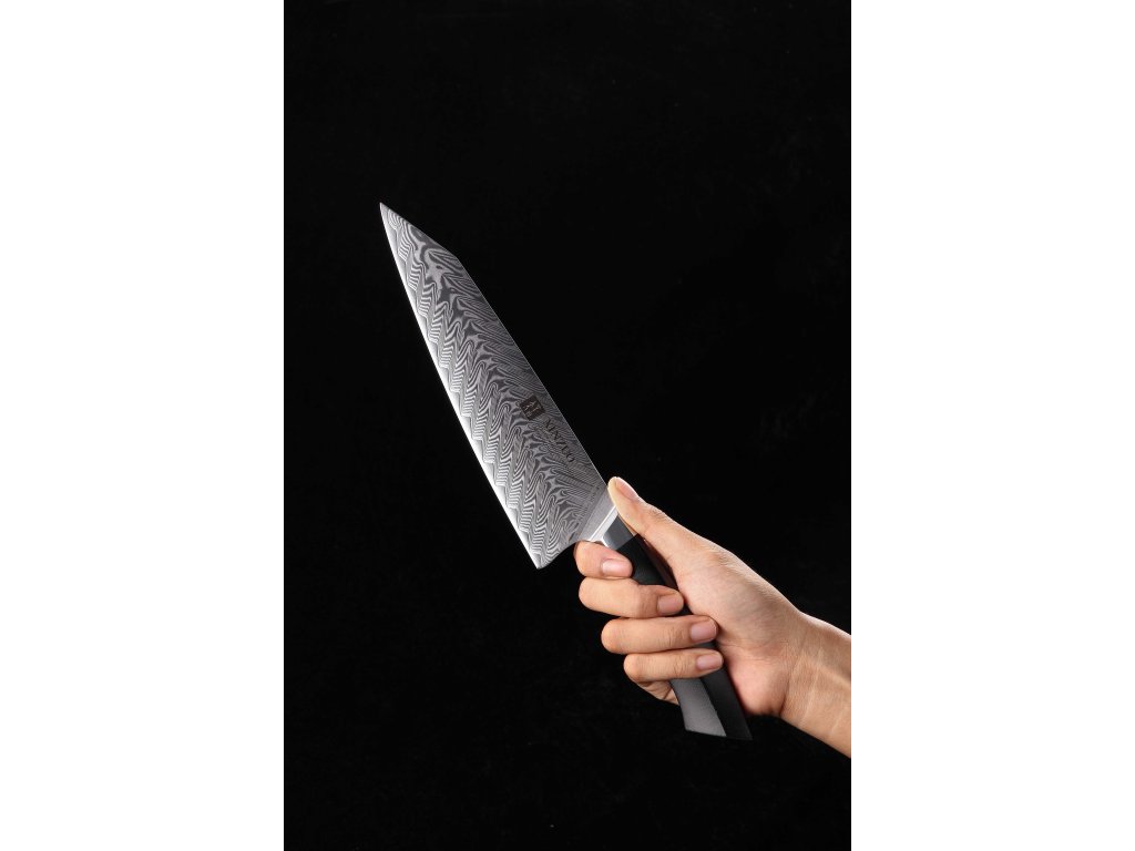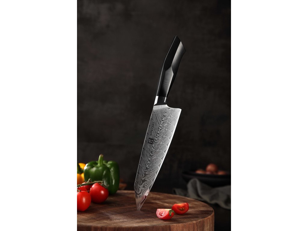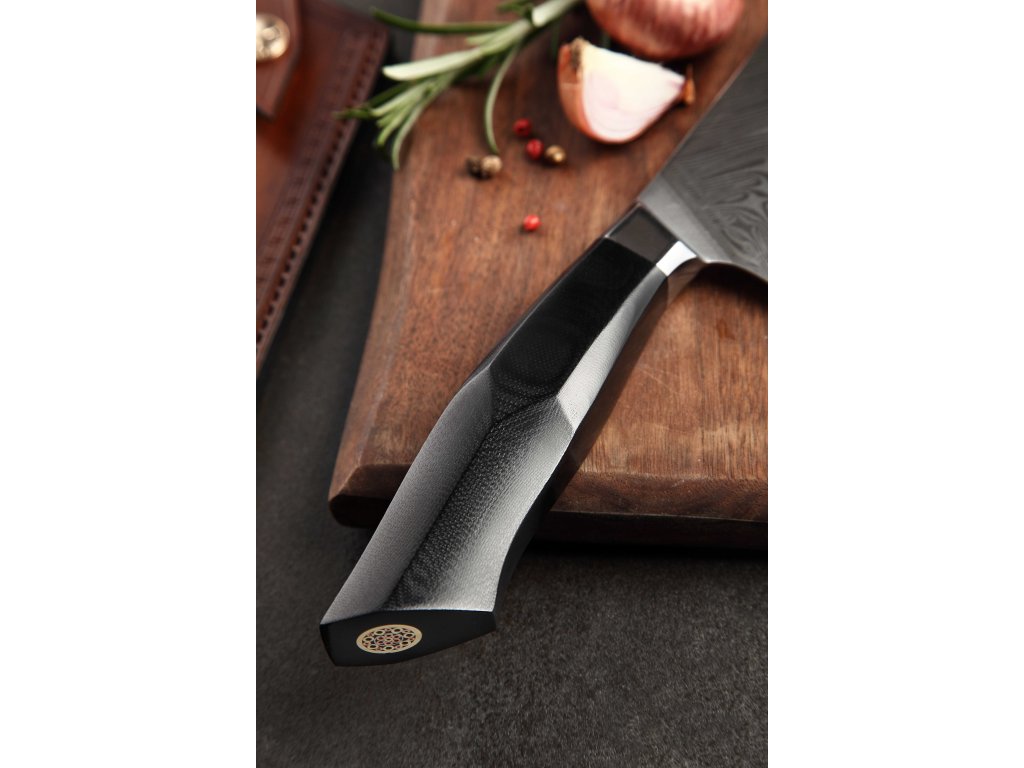 Dieses Chefmesser ist aus hochwertigem Damaszener Stahl gefertigt, der für die Herstellung der besten Messer verwendet wird. Die Messerklinge mit einer Härte von 60±2 Rockwell besteht aus 67 Lagen. Hochwertiger Stahl in einer Kombination von traditioneller Herstellung garantiert eine lange Lebensdauer des Messers. Die Oberfläche des Messers bietet beim Schneiden Komfort, ohne dass es reibt oder dass die Zutaten an die Klinge pappen. Der Messergriff besteht aus dem Verbundmaterial G10, das mit der Zeit weder weicher wird noch Geruch annimmt. Dank seiner perfekten Form und Länge wird das Schneiden zum Vergnügen und außerdem liegt das Messer gut in der Hand. Der Farbton des Musters auf der Klinge kann unterschiedlich sein, da jedes Messer durch das Stahlschichten einzigartig ist.