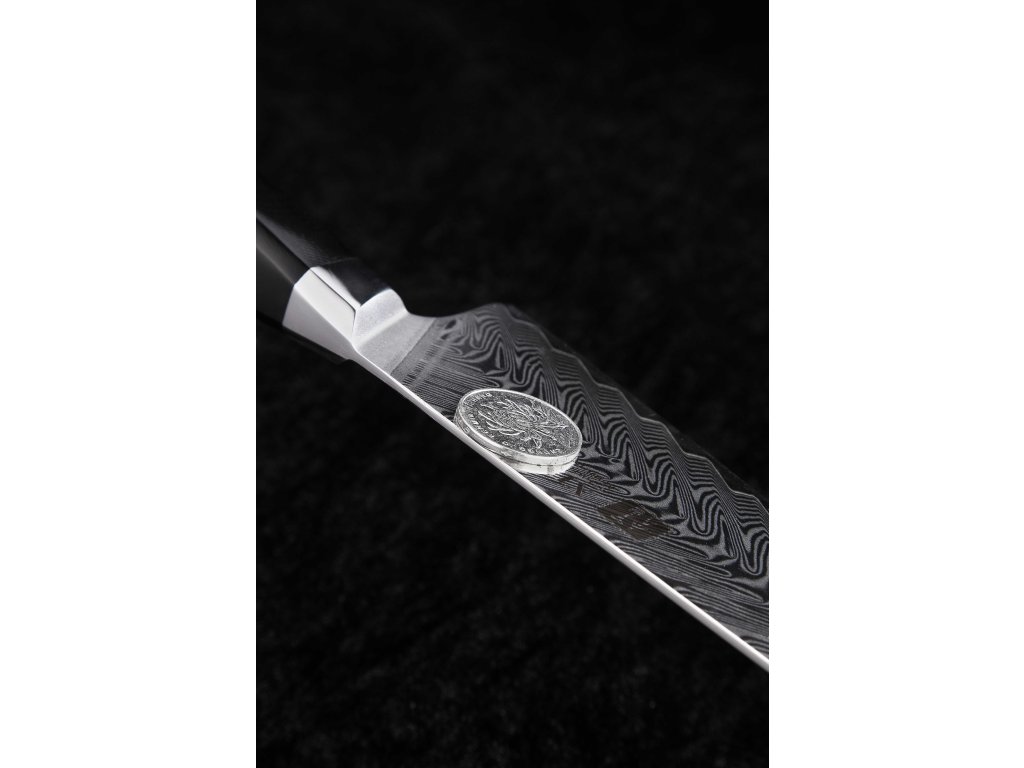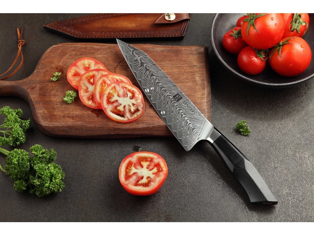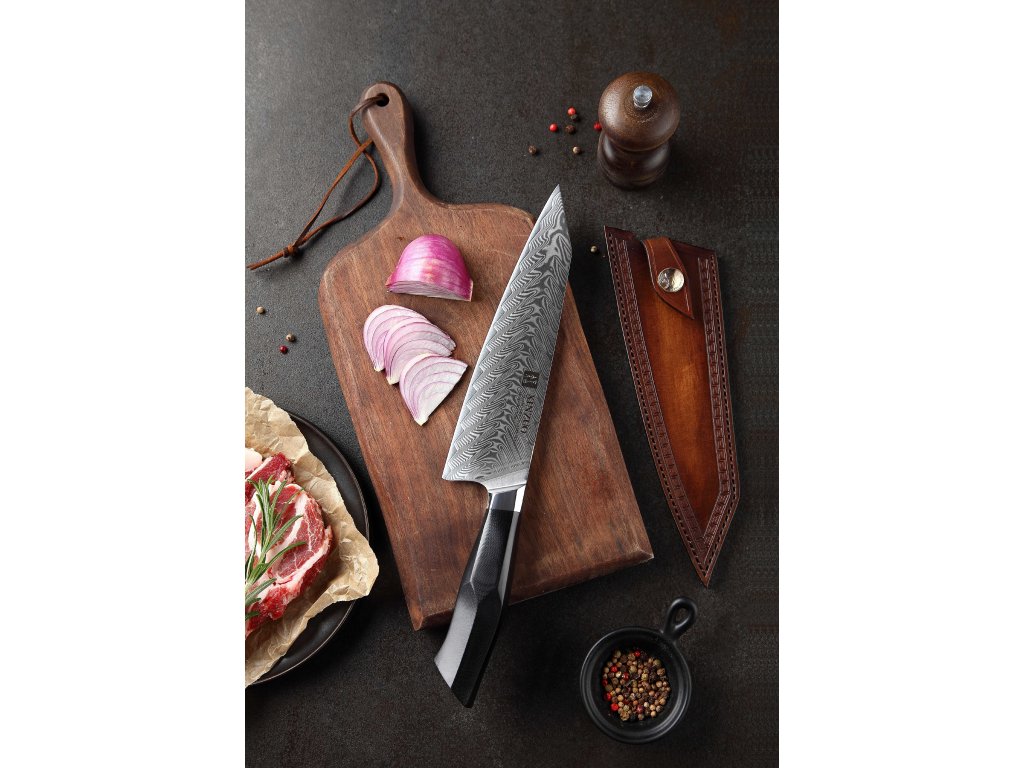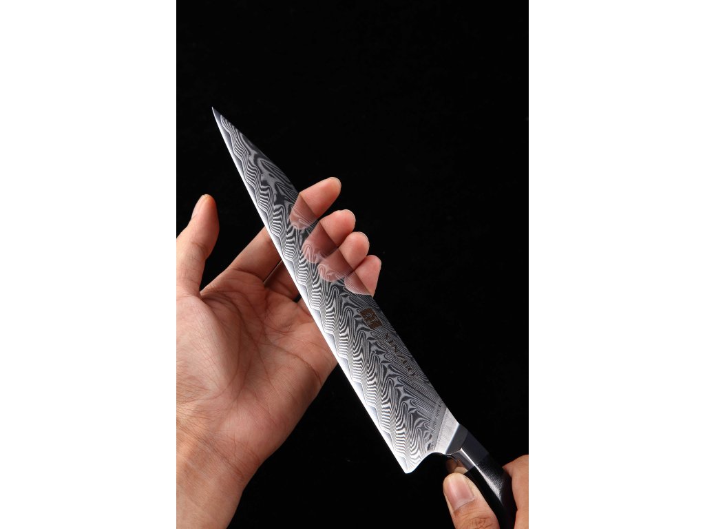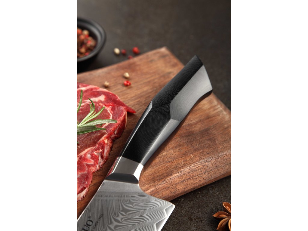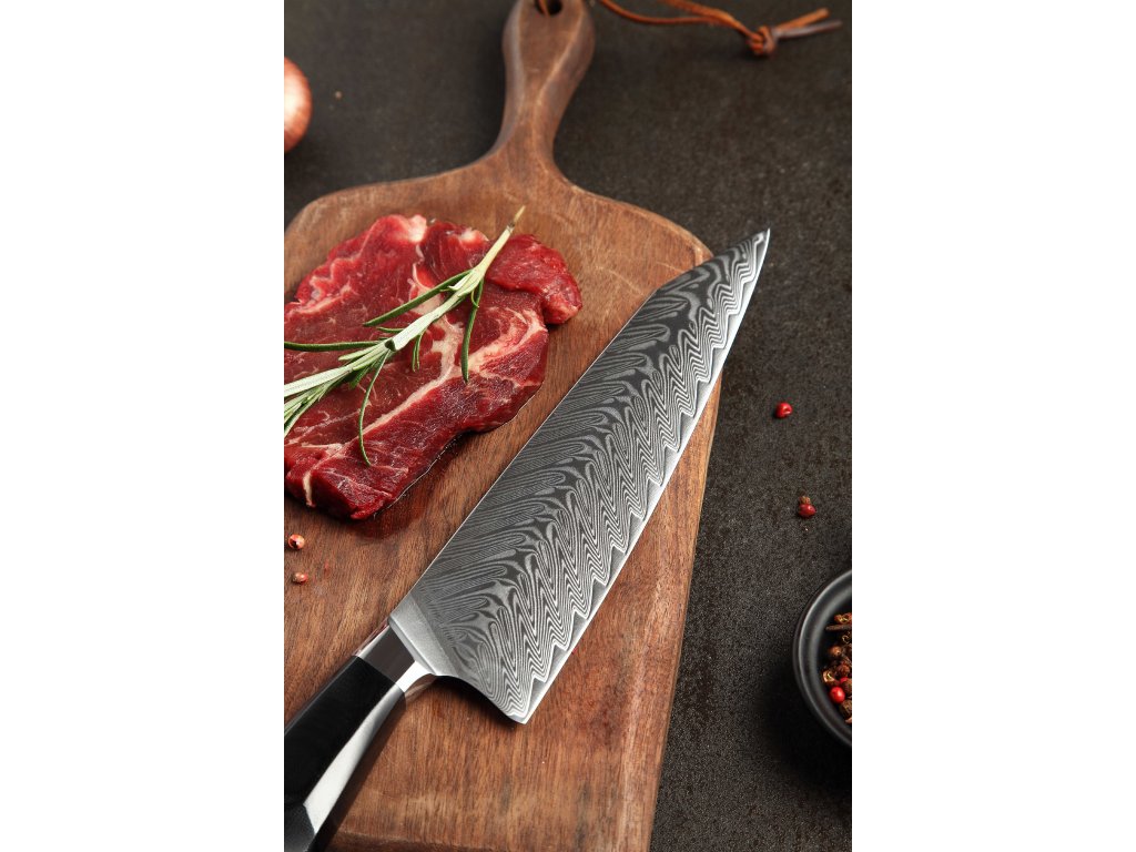 Dieses Chefmesser ist aus hochwertigem Damaszener Stahl gefertigt, der für die Herstellung der besten Messer verwendet wird. Die Messerklinge mit einer Härte von 60±2 Rockwell besteht aus 67 Lagen. Hochwertiger Stahl in einer Kombination von traditioneller Herstellung garantiert eine lange Lebensdauer des Messers. Die Oberfläche des Messers bietet beim Schneiden Komfort, ohne dass es reibt oder dass die Zutaten an die Klinge pappen. Der Messergriff besteht aus dem Verbundmaterial G10, das mit der Zeit weder weicher wird noch Geruch annimmt. Dank seiner perfekten Form und Länge wird das Schneiden zum Vergnügen und außerdem liegt das Messer gut in der Hand. Der Farbton des Musters auf der Klinge kann unterschiedlich sein, da jedes Messer durch das Stahlschichten einzigartig ist.