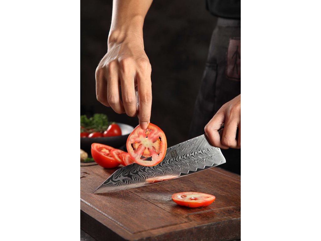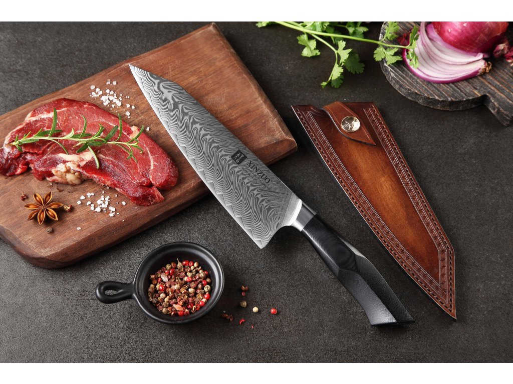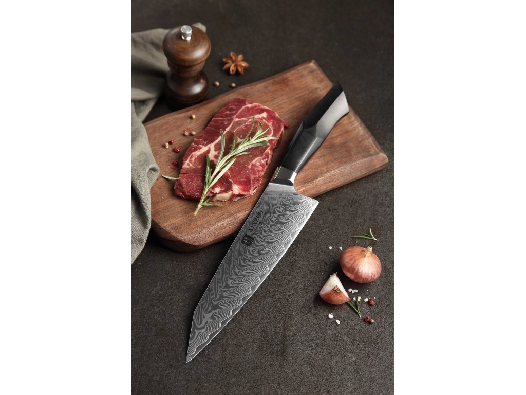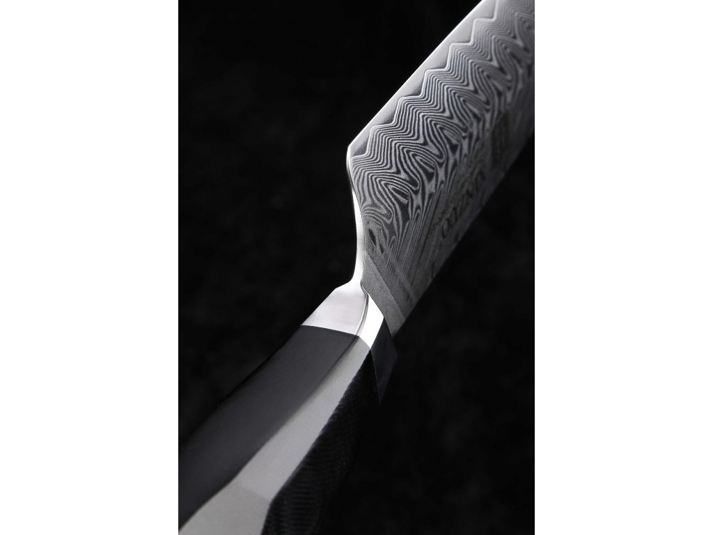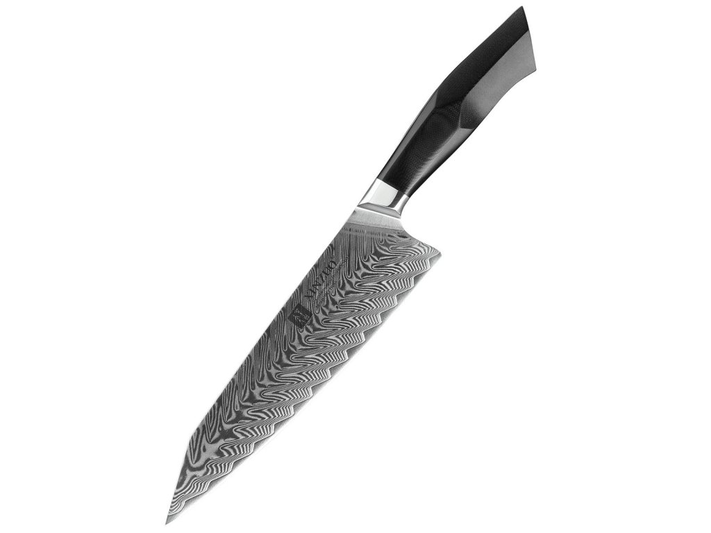 Dieses Chefmesser ist aus hochwertigem Damaszener Stahl gefertigt, der für die Herstellung der besten Messer verwendet wird. Die Messerklinge mit einer Härte von 60±2 Rockwell besteht aus 67 Lagen. Hochwertiger Stahl in einer Kombination von traditioneller Herstellung garantiert eine lange Lebensdauer des Messers. Die Oberfläche des Messers bietet beim Schneiden Komfort, ohne dass es reibt oder dass die Zutaten an die Klinge pappen. Der Messergriff besteht aus dem Verbundmaterial G10, das mit der Zeit weder weicher wird noch Geruch annimmt. Dank seiner perfekten Form und Länge wird das Schneiden zum Vergnügen und außerdem liegt das Messer gut in der Hand. Der Farbton des Musters auf der Klinge kann unterschiedlich sein, da jedes Messer durch das Stahlschichten einzigartig ist.