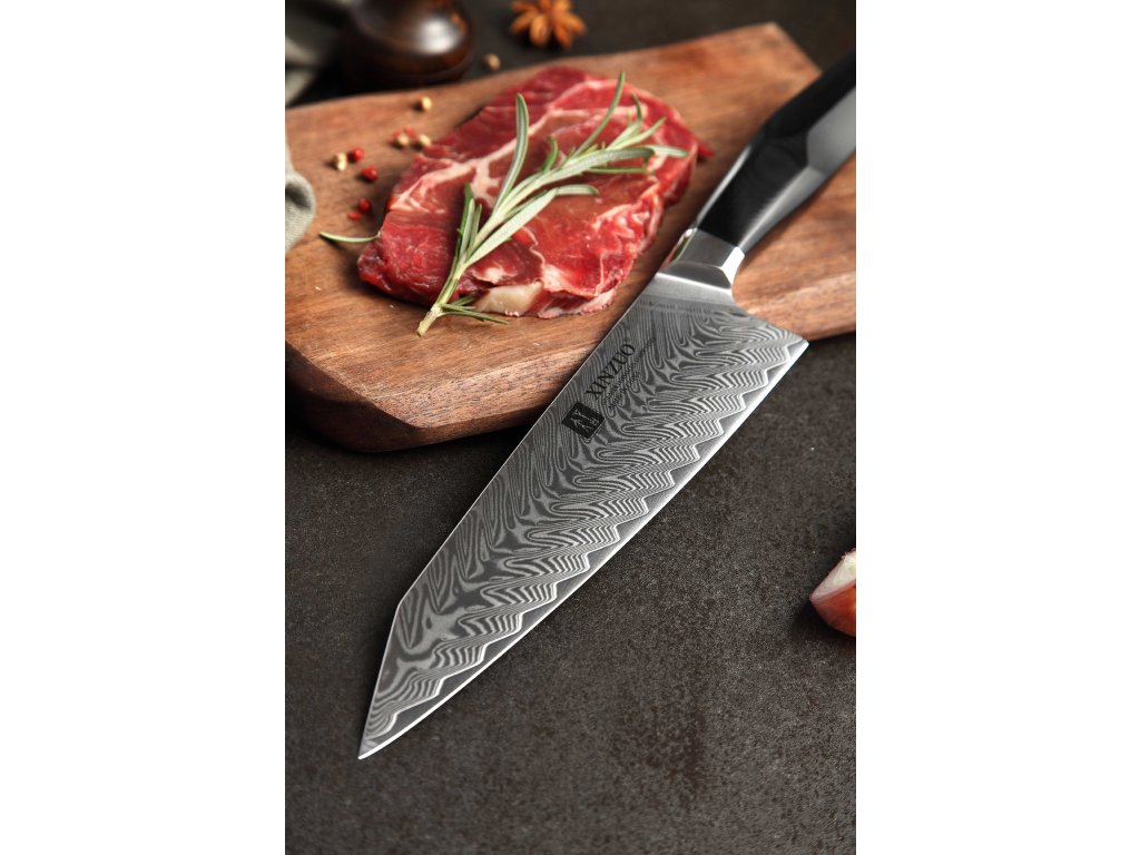 Damast Kochmesser XinZuo Feng B32 aus Damaszener Stahl mit einzigartigem G10-Verbundgriff. Klinge 22 cm.